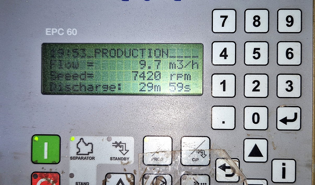 Max bowl speed 7500 RPM, rated @ 20,000 LPH, liquid discharged under pressure, low shear inlet design, Smart Eject self-triggering system, Oxy-Stop hydro-hermetic seal and jacketed hood. 25 KW motor 460/3/60/1800 RPM with VFD, sludge cyclone, flow meter, valves, piping, 3.5 KW feed pump motor, 4 KW solids pump motor, tools and PLC control panel, unitized on a portable cart. Prior use: Pea protein isolate. 2015 vintage. Excellent working condition. aka VNPX 810-SGV-34CGL. Located in Mexico.