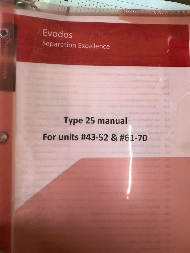 Designed for algae harvesting. Separation occurs @ 3000 x G. 250 to 4000 LPH capacity. Up to 15 L compressed solids per discharge (4 per hour). 10 KW motor 380/460/3/50/60 and Siemens PLC control panel. Excellent condition.