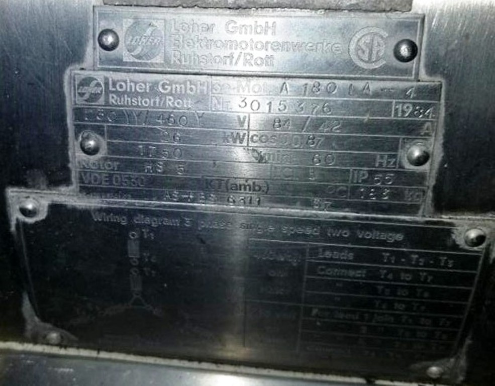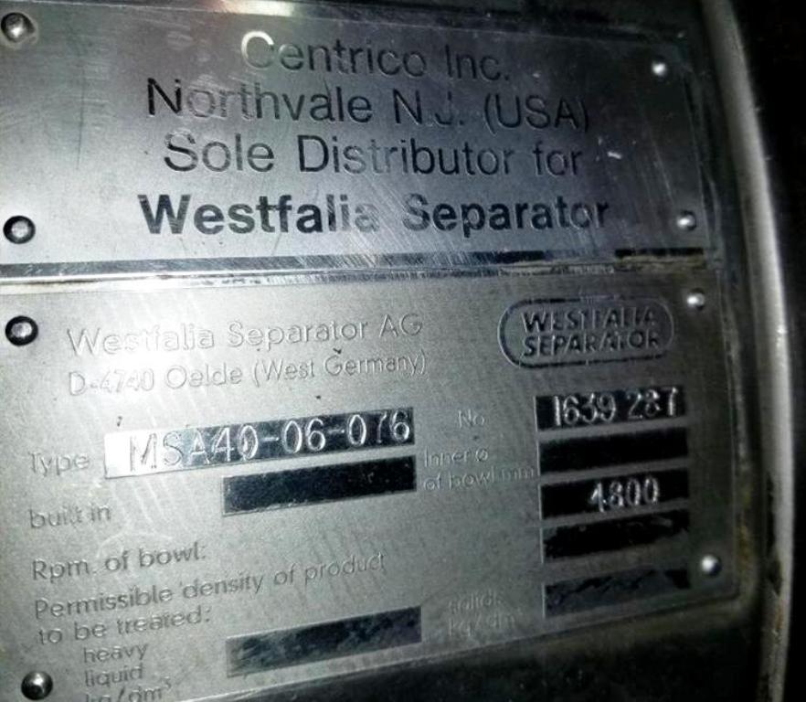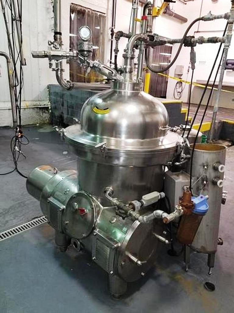 Max bowl speed 4800 RPM, rated @ 22,000 LPH, 50,000 PPH. 26 KW motor 230/460/3/60/1750 RPM, sludge tank, piping, gauges, tools, manual and control panel. Prior use: Apple juice. Excellent condition.