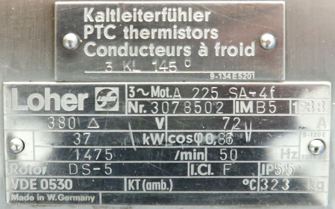 Max bowl speed 4700 RPM, rated @ 30,000 LPH. 37 KW motor 380/3/50/1475 RPM, water harness, base frame, tools, all valves, flow meter and manual. No control panel. 1991 vintage. Very good condition. Located in Europe.