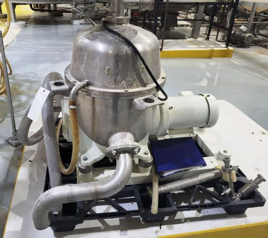 Max bowl speed 8510 RPM, rated @ 10 GPM, sanitary design, 5 HP XP motor 230/460/3/60/1735 RPM, tools and control panel. 1989 vintage. Excellent condition.