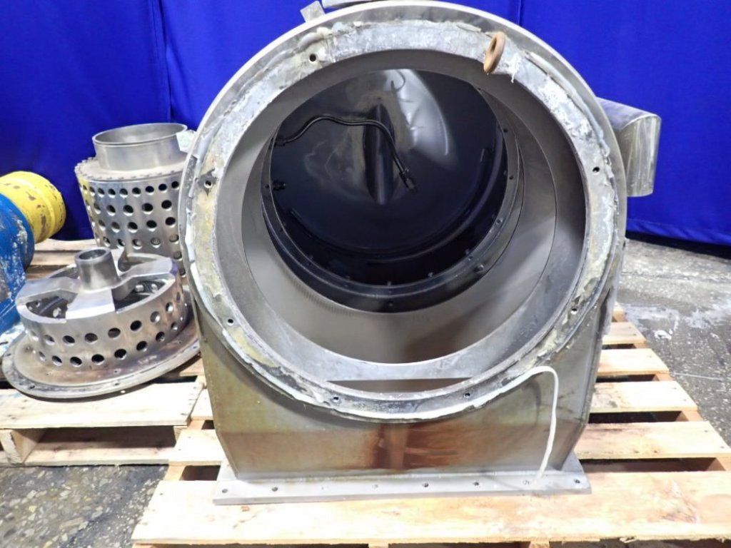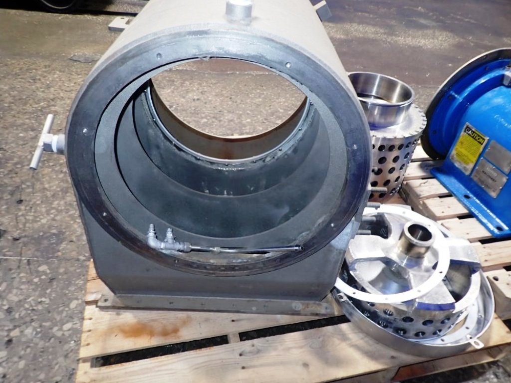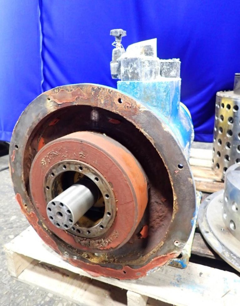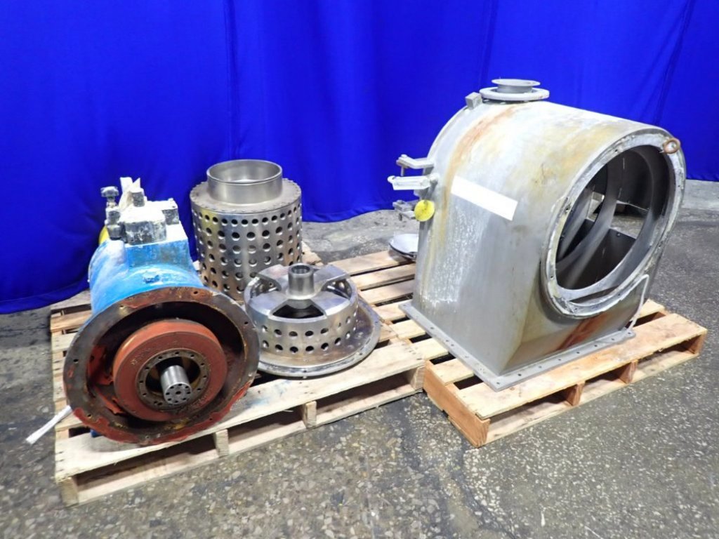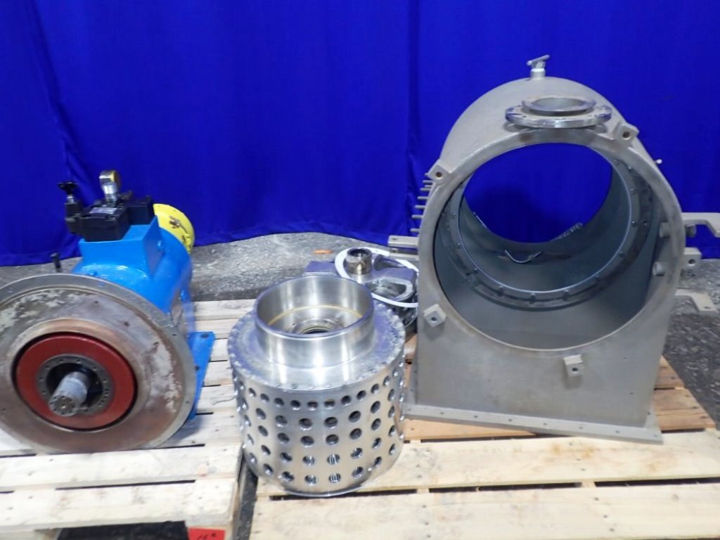 Max bowl speed 2200 RPM, two stages, rated @ 5 TPH (25% feed solids) to achieve 1-2% cake moisture on sodium chlorate with hydraulic pusher motor. Missing base and 22 KW drive motor. 1995 vintage. Excellent condition.
