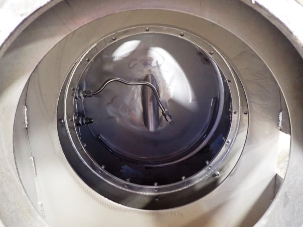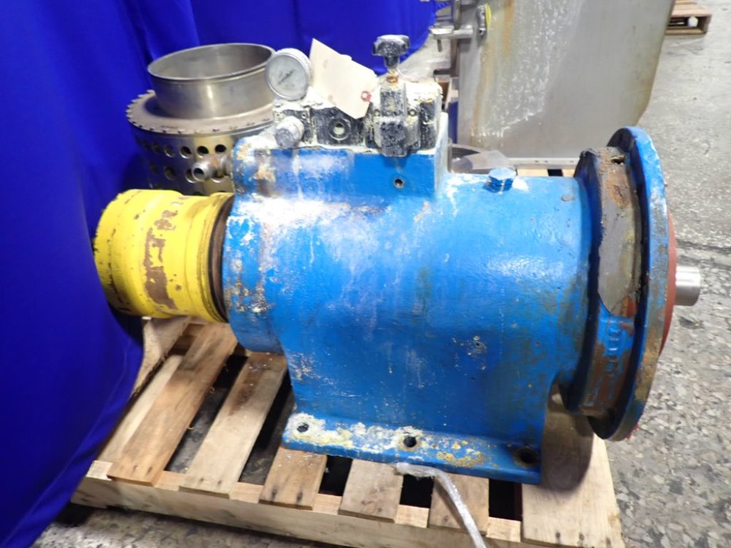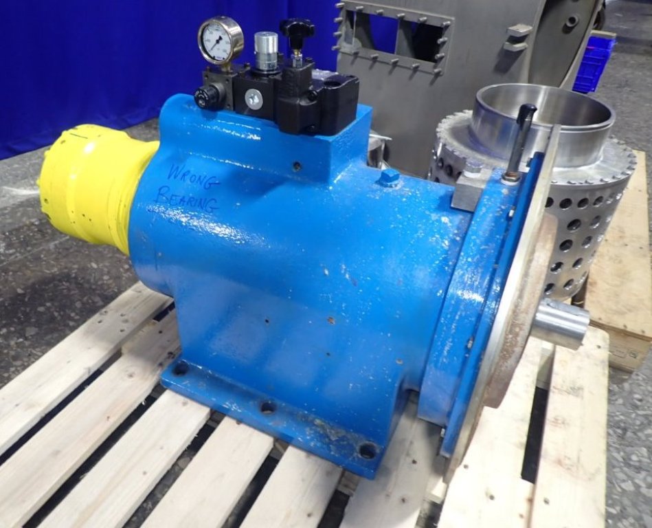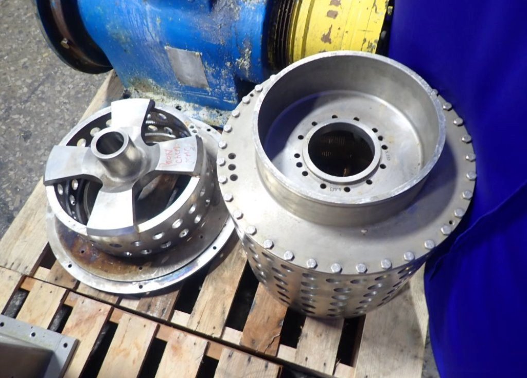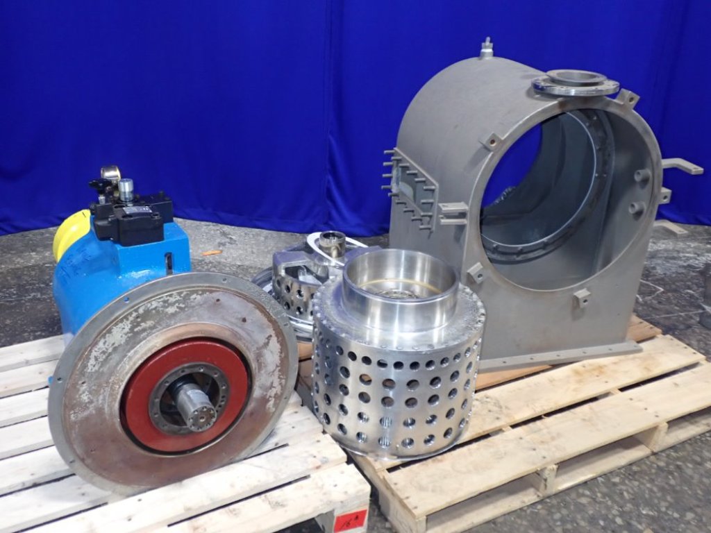 Max bowl speed 2200 RPM, two stages, rated @ 5 TPH (25% feed solids) to achieve 1-2% cake moisture on sodium chlorate with hydraulic pusher motor. Missing base and 22 KW drive motor. 1995 vintage. Excellent condition.
