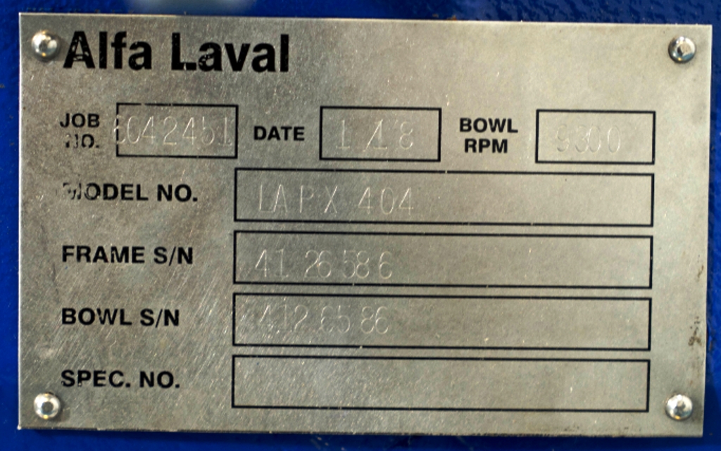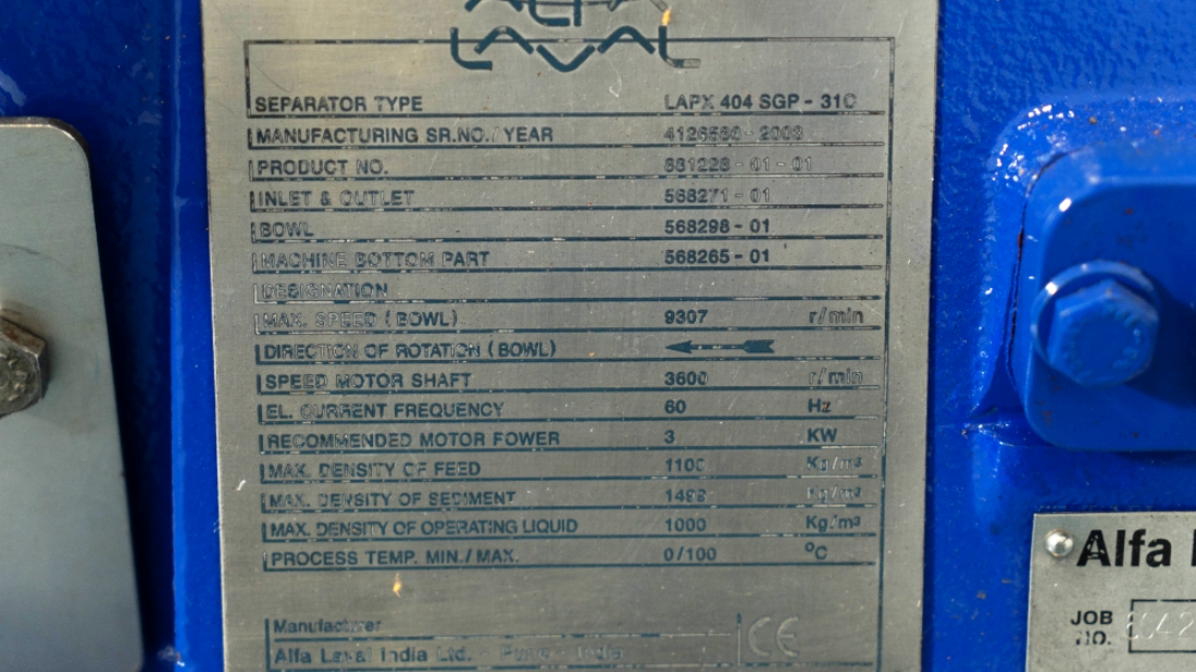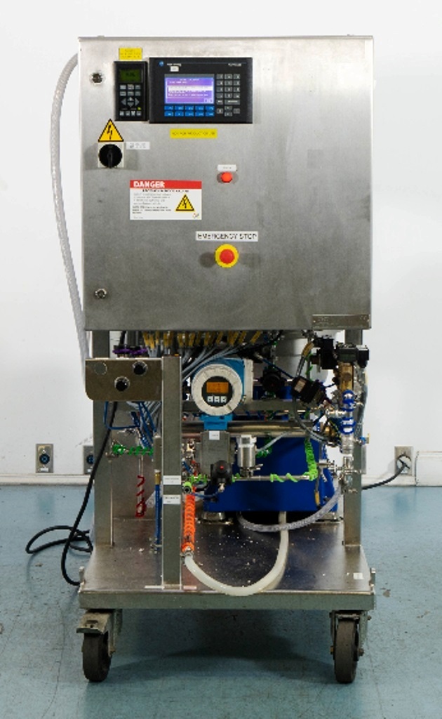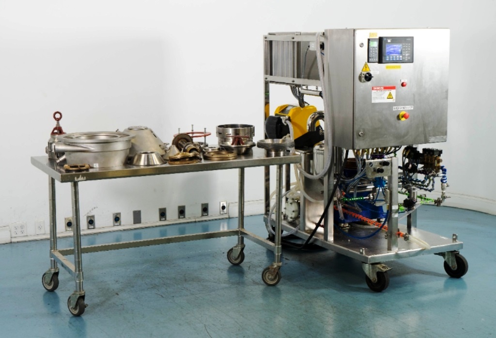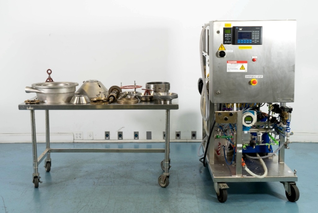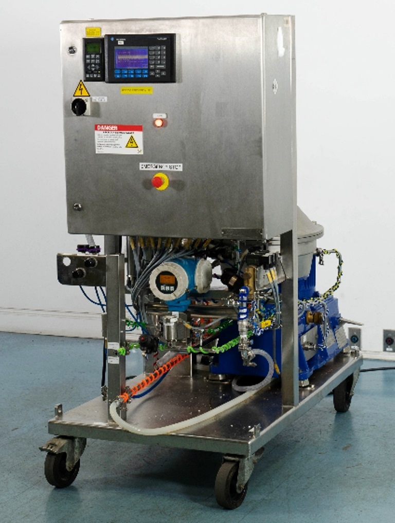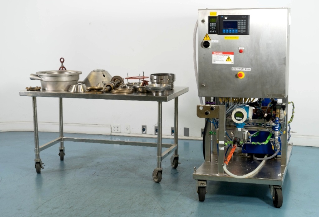 Max bowl speed 9600 RPM, 11,000 x G, rated @ 4000 LPH, max solids capacity 33 LPH, 0-100C temp range. Liquid discharged under pressure, low shear disc inlet design, 3.7 KW motor 460/3/60/3470 RPM, piping, tools and Allen-Bradley PanelView 500 control panel, unitized on a portable cart. 2003 vintage. Very good condition.