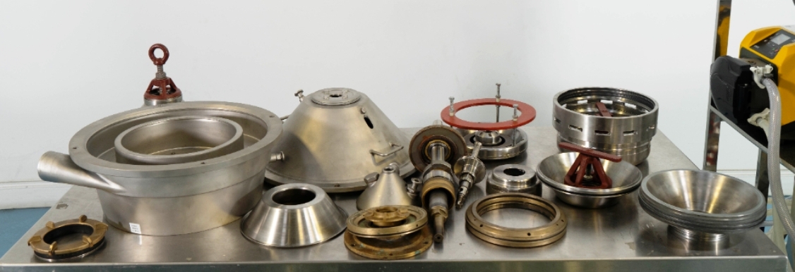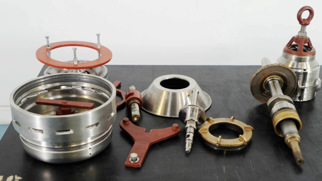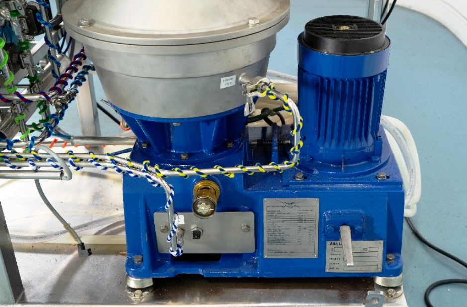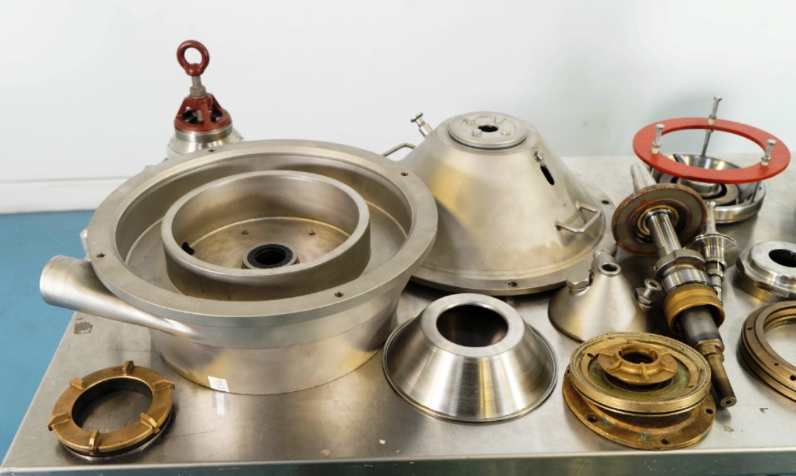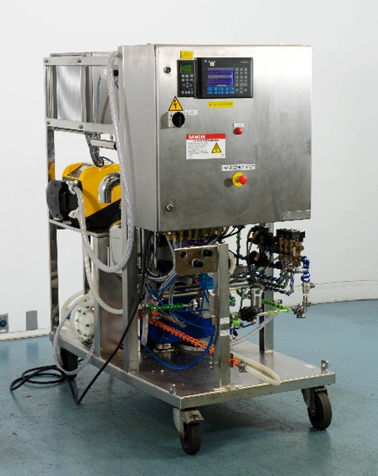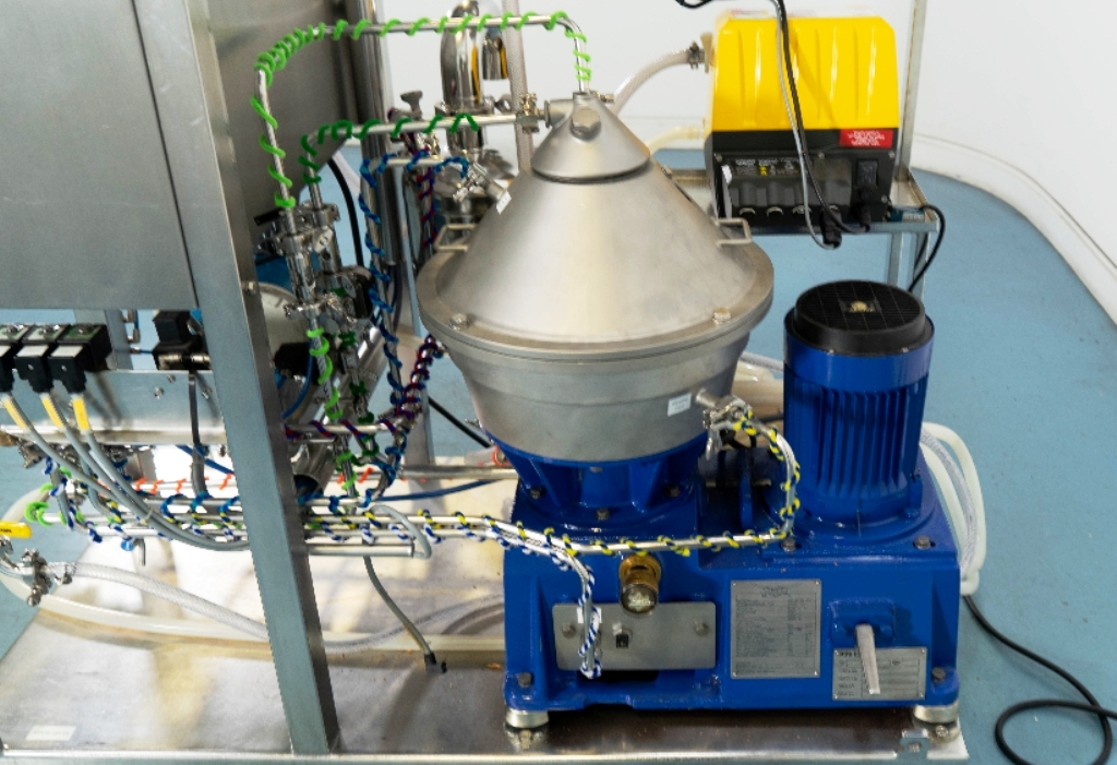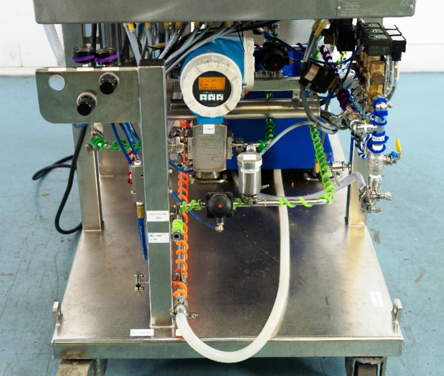 Max bowl speed 9600 RPM, 11,000 x G, rated @ 4000 LPH, max solids capacity 33 LPH, 0-100C temp range. Liquid discharged under pressure, low shear disc inlet design, 3.7 KW motor 460/3/60/3470 RPM, piping, tools and Allen-Bradley PanelView 500 control panel, unitized on a portable cart. 2003 vintage. Very good condition.
