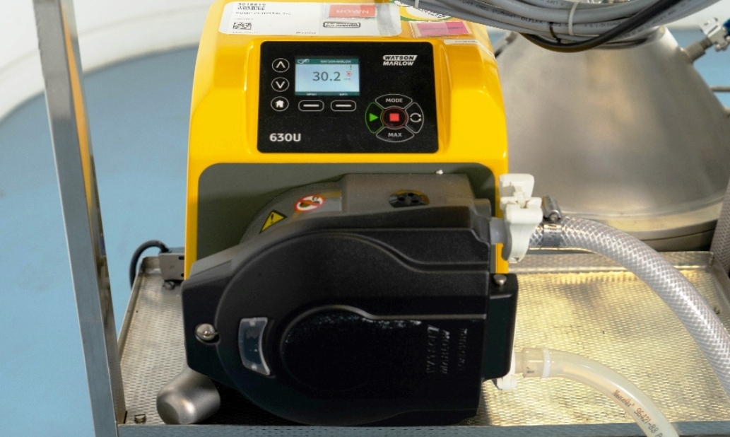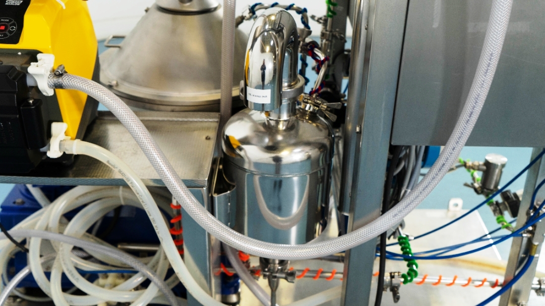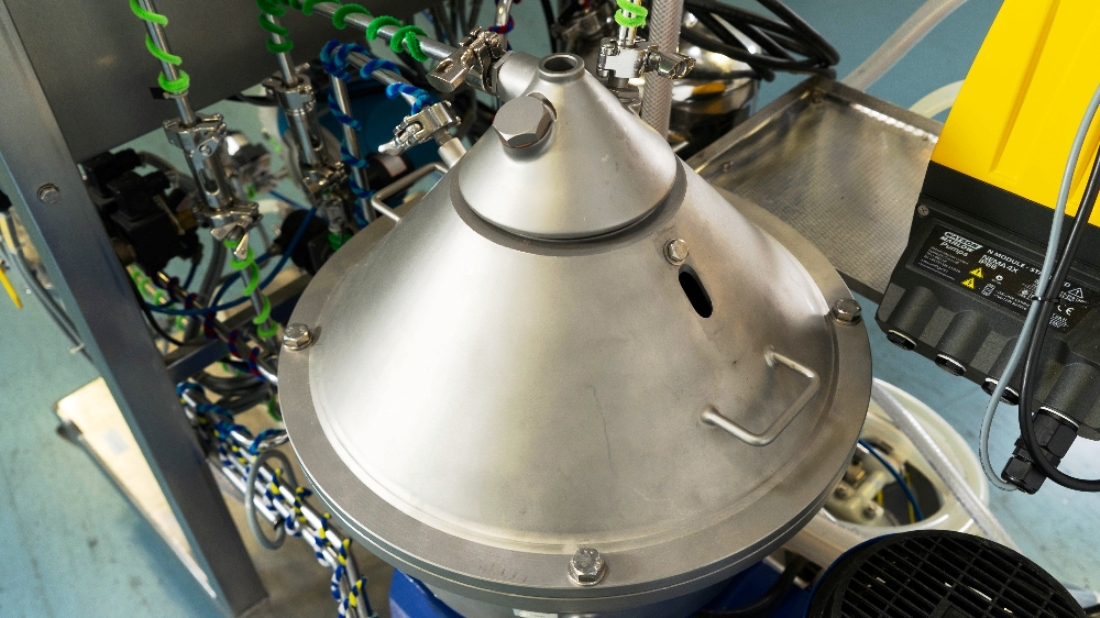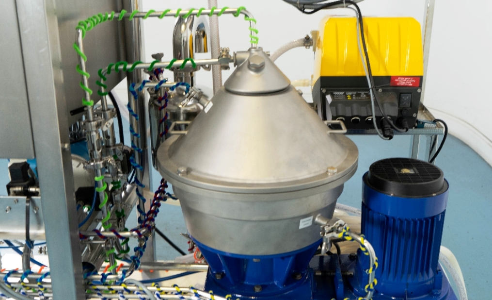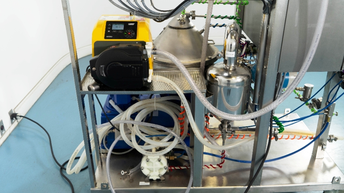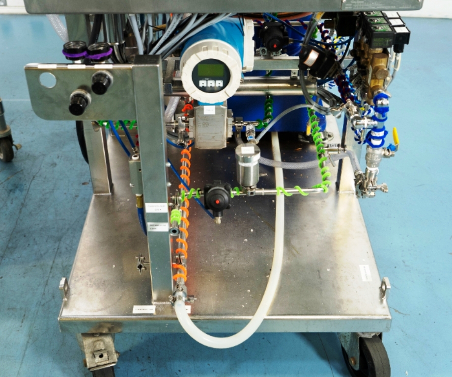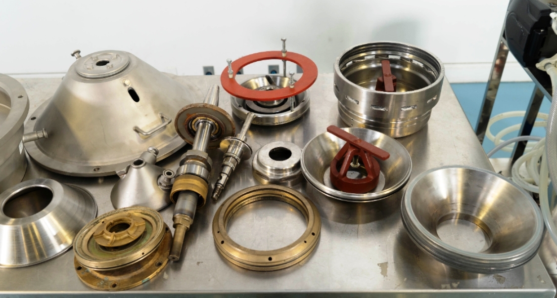 Max bowl speed 9600 RPM, 11,000 x G, rated @ 4000 LPH, max solids capacity 33 LPH, 0-100C temp range. Liquid discharged under pressure, low shear disc inlet design, 3.7 KW motor 460/3/60/3470 RPM, piping, tools and Allen-Bradley PanelView 500 control panel, unitized on a portable cart. 2003 vintage. Very good condition.