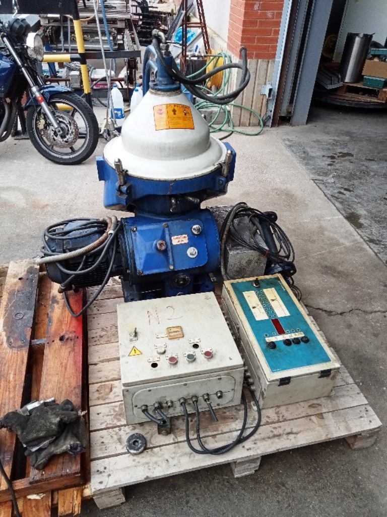 Max bowl speed 7540 RPM, rated @ 1250 LPH on lube oil. Liquid phase discharged under pressure, self-triggered ejection of solids via dosing ring, 4 KW motor 380/3/50/1500 RPM with tools and controls. 1999 vintage. Excellent condition. Located in Europe.