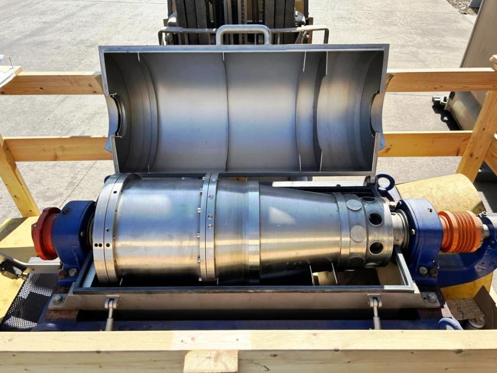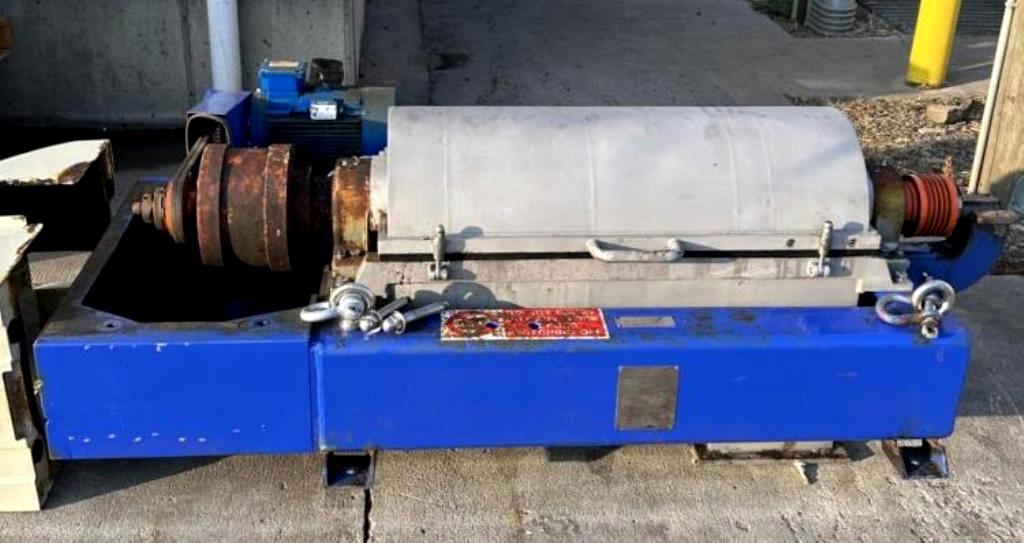 Max bowl speed 4000 RPM, 3150 x G, 70mm single lead hardsurfaced conveyor, 25 HP motor 460/3/60/1760 RPM, 159:1 2.5 kMn gearbox, feed tube, guard, stand and control panel. 2001 and 2004 vintage. Very good condition.