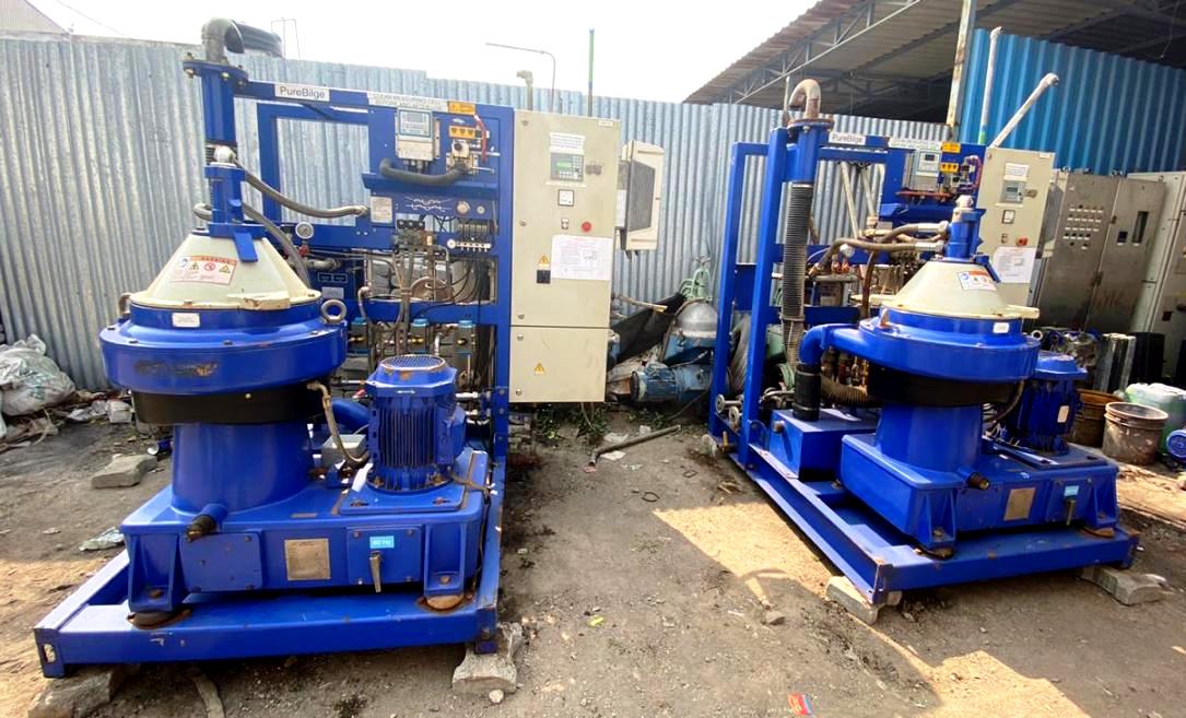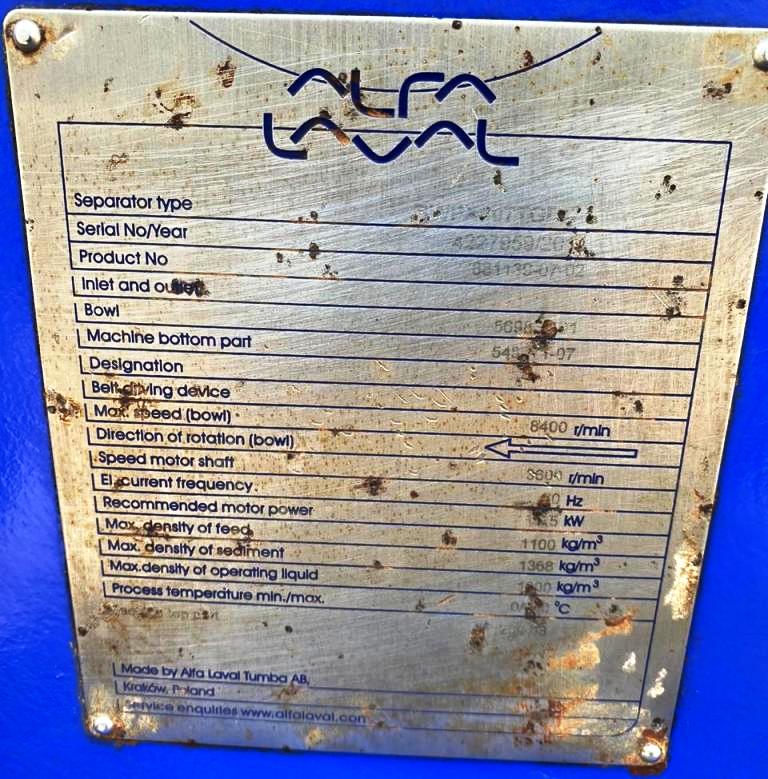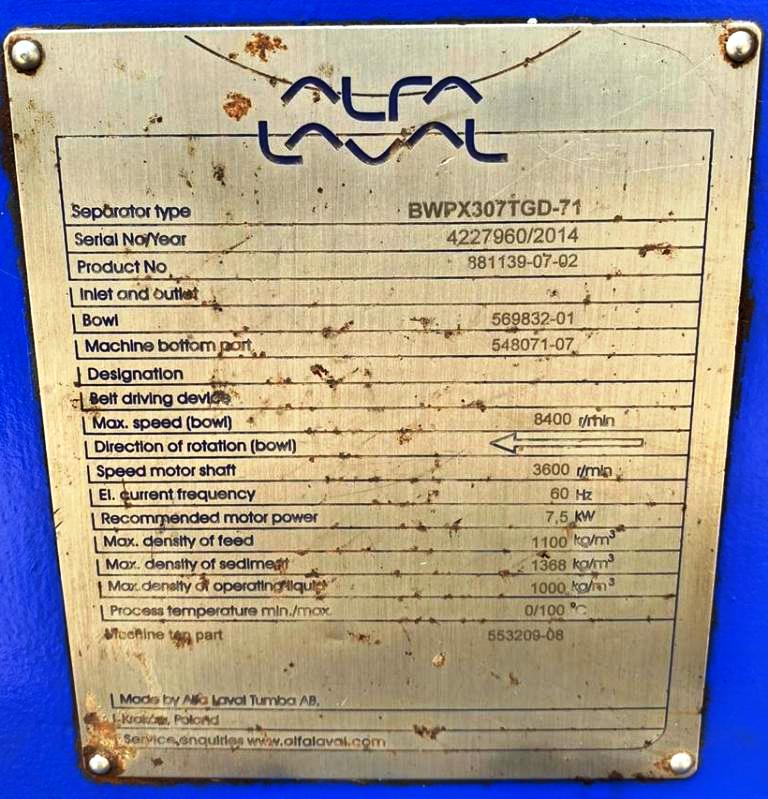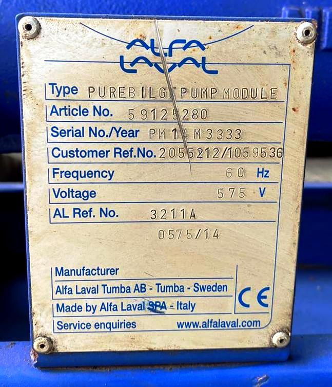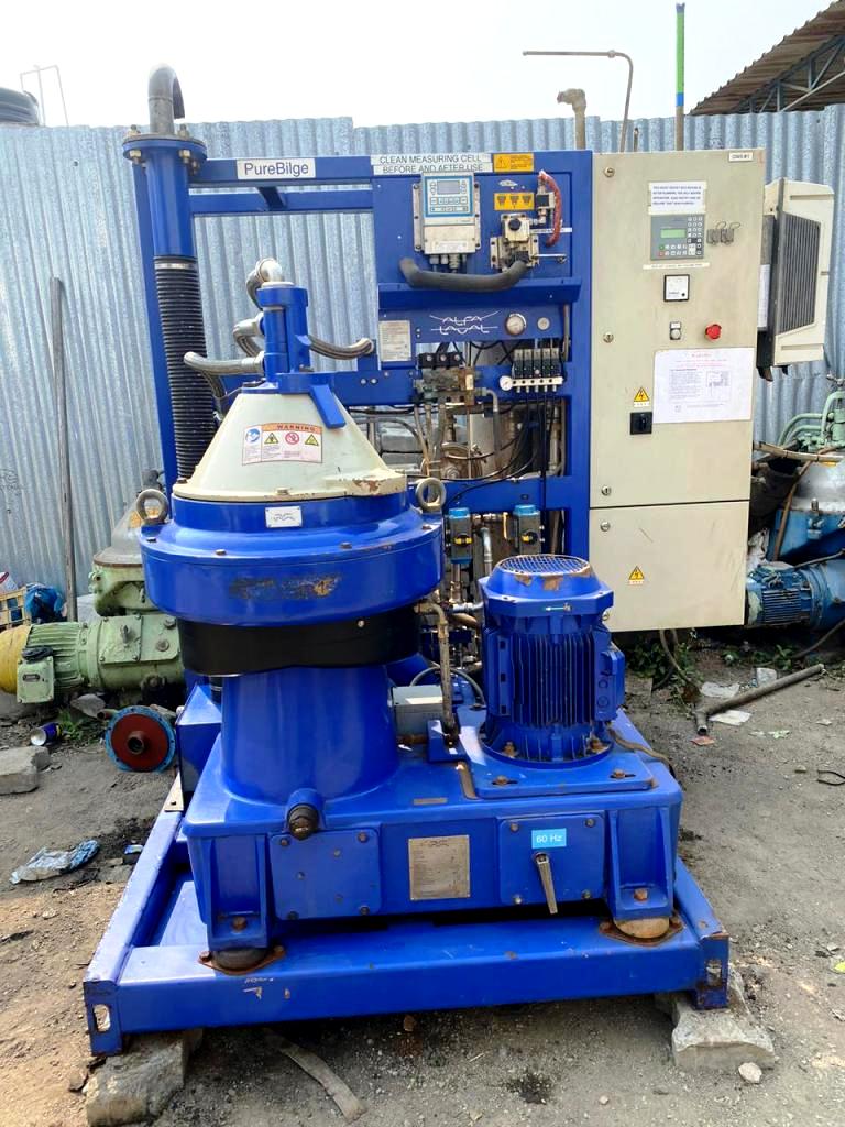 Max bowl speed 8400 RPM, both liquid phases discharged under pressure, full shoot design, rated @ 2500 LPH. 7.5 KW motor 440/3/60/3600 RPM, Netzsch pump, heater, tank, tools and control panels. 2014 vintage. Excellent condition. aka: Pure Bilge 2515E Systems. FCA India.