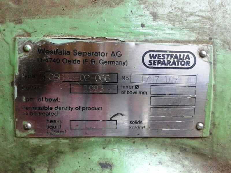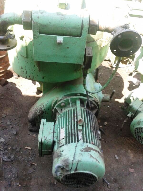 Max bowl speed 6540 RPM, rated @ 12,300 LPH, oil discharge under pressure, 20 HP motor 230/460/3/60/1750 RPM. 1993 vintage. Very good condition. FCA India.