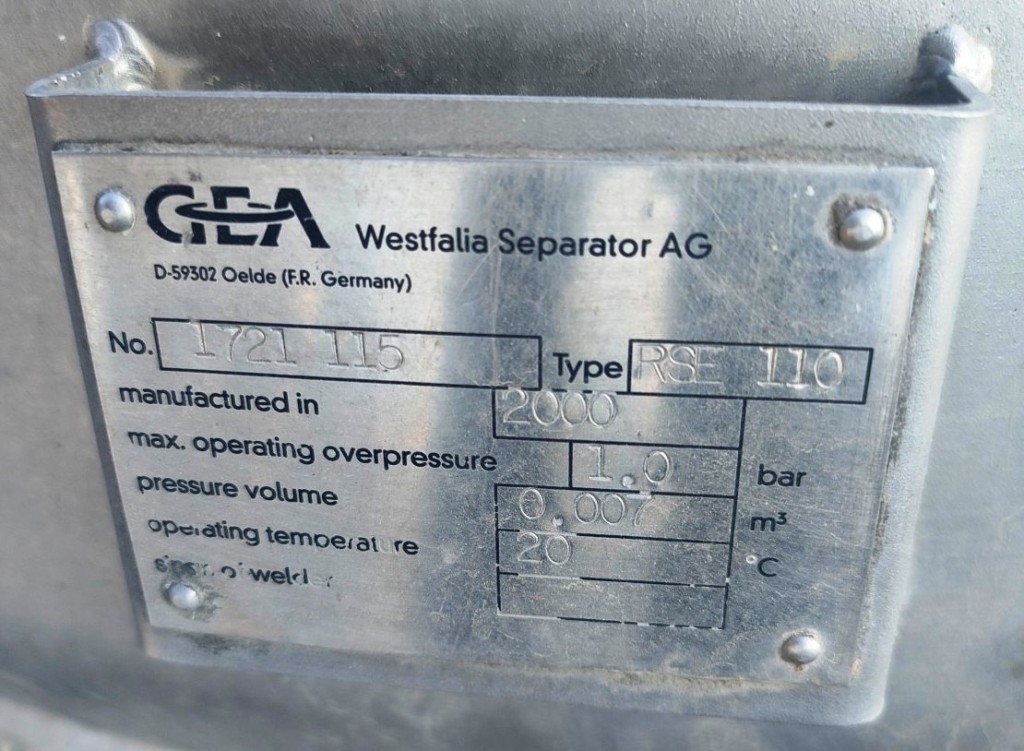 (2) Westfalia RSE 110-01-776 vegetable oil separators, 316SS. are engineered for high-efficiency separation of vegetable oils, making them an ideal choice for industries that require reliable and effective processing solutions. With a maximum bowl speed of 5260 RPM and a centrifugal force of 8950 x G, these separators are capable of handling large volumes of liquid with a rated capacity of 30,000 liters per hour (LPH). The design ensures that both liquid phases are discharged under pressure, optimizing the separation process and minimizing downtime. The robust 30 KW motor operates at 380V, 3-phase, 50 Hz, with a speed of 1460 RPM, ensuring consistent performance even in demanding operational environments. These separators are vintage models from 2000 and 2001, yet they remain in very good condition, demonstrating the durability and longevity of Westfalia's engineering excellence.