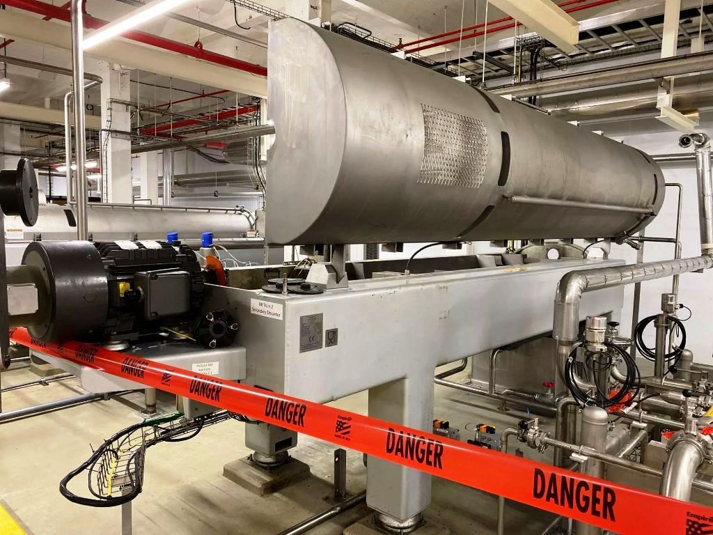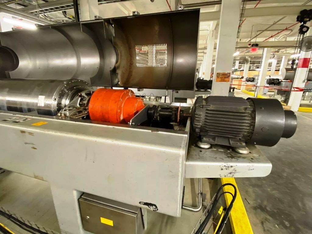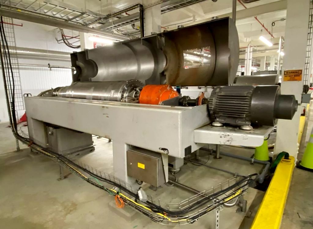 Constructed from high-grade 316 stainless steel, these centrifuges are not only robust but also resistant to corrosion, making them suitable for handling various liquids, including those with high acidity or other challenging properties. The 7.5-inch single lead hardsurfaced conveyor and the powerful 75 HP motor (460/3/60/1780 RPM) work in tandem to ensure that the solids are efficiently conveyed out of the bowl, while the 30 HP backdrive provides additional support during operation. The inclusion of guards, a CIP (Clean-In-Place) bar, and vibration switch/isolators enhances the safety and maintenance of the equipment. With a compact footprint of 575 x 2565mm (22.6 x 101 inches) and mounted on a 4-foot stand, these centrifuges are designed for easy integration into existing production lines, making them an excellent choice for facilities looking to upgrade their processing capabilities.