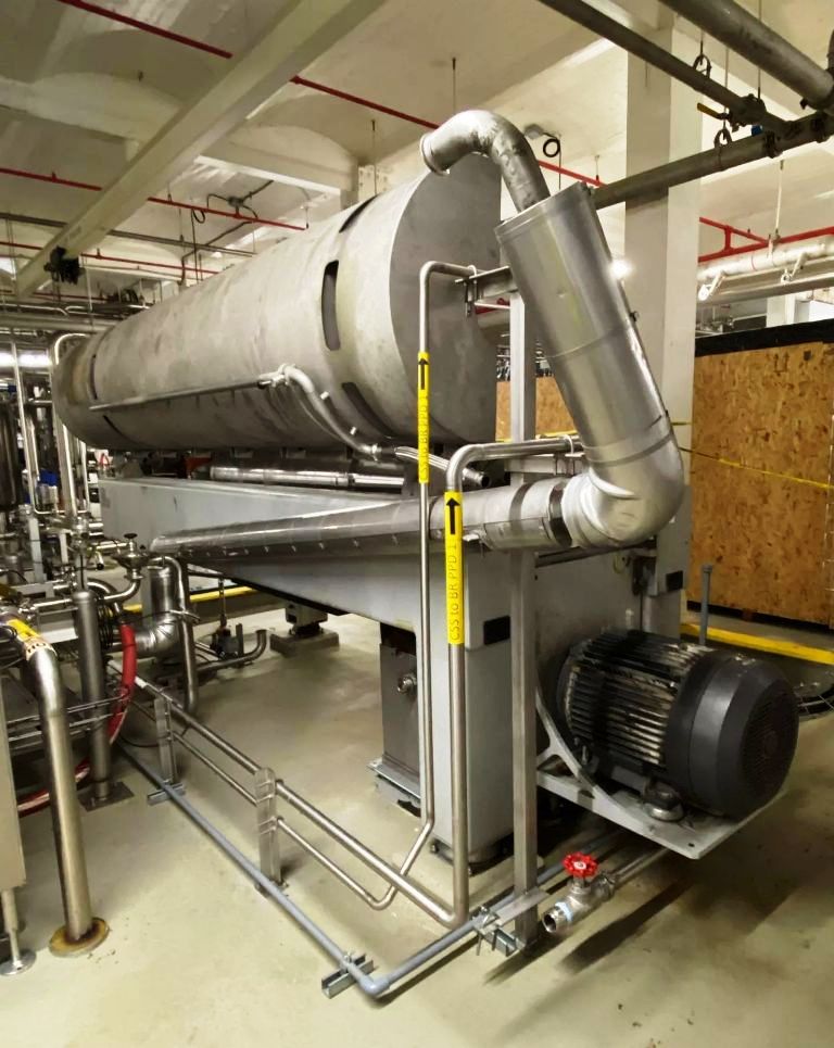 Max bowl speed 3075 RPM, 3040 x G, 575 x 2565mm (22.6 x 101") bowl ID. 10 degree beach angle, 360 degree cake discharge, liquid discharged under pressure via paring disc thru skimmer tube, 7.5" single lead hardsurfaced conveyor, 75 HP motor 460/3/60/1780 RPM, 102:1 12 kNm DD gearbox, 30 HP backdrive, guards, CIP bar, feed tube, vibration switch/isolators and chutes, mounted on 4' stand. 2021 vintage. Prior use: Brewery. Excellent condition.