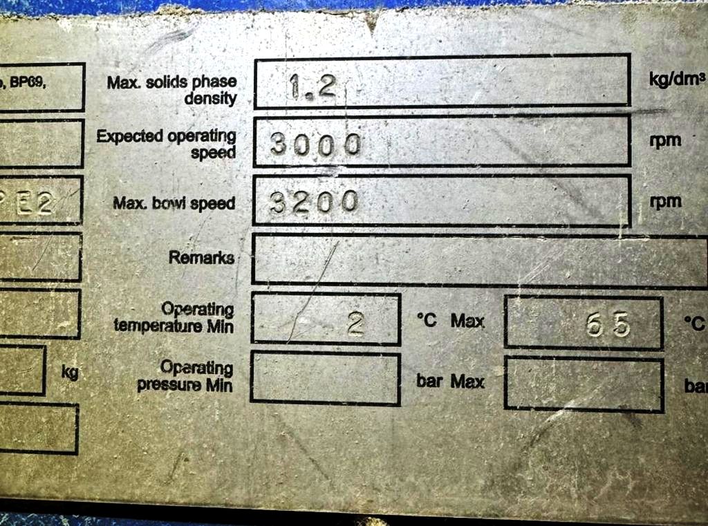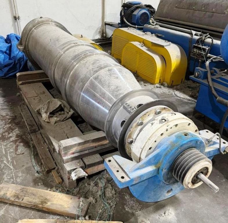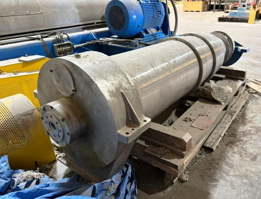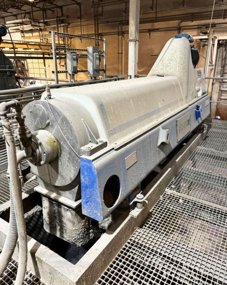 Max bowl speed 3200 RPM, 2976 x G, 520 x 2600mm (20.5 x 102") bowl ID, rated @ 260 GPM. 11 degree grooved beach, fiberglass top cover, 316L SS lower casing, 6" single lead hardsurfaced conveyor, 75 HP XP motor 460/3/60/1780 RPM, 20 HP XP backdrive, cyclo gearbox, guards, feed tube, vibration switch/isolators, chutes, PLC control panel with VFDs and HMI panel. 2018 vintage. Prior use: Nylon fiber dewatering. Very good condition.