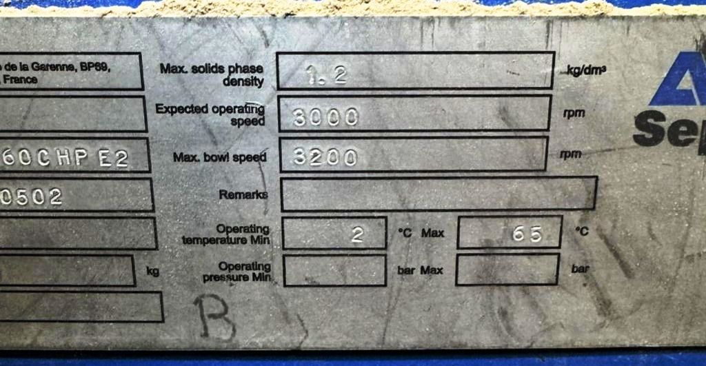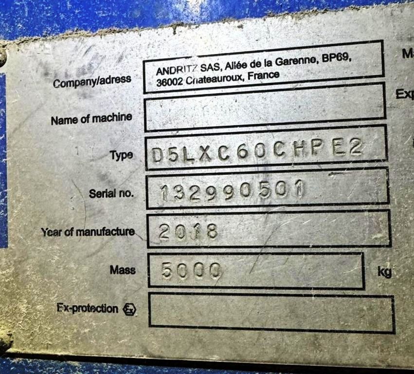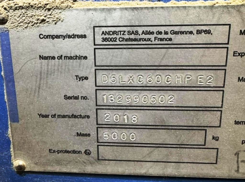 The (3) Andritz D5LX C60 CHP E2 decanter centrifuges, 316L SS are engineered for high-performance separation processes, particularly suitable for applications such as nylon fiber dewatering. With a maximum bowl speed of 3200 RPM and a centrifugal force of 2976 x G, these centrifuges are designed to efficiently handle large volumes of material, rated at 260 gallons per minute (GPM). The robust construction features a 316L stainless steel lower casing, which not only enhances durability but also ensures resistance to corrosion and wear, making it ideal for demanding industrial environments. The 11-degree grooved beach design optimizes the separation process, allowing for effective solid-liquid separation while minimizing the risk of clogging and ensuring a consistent output quality.