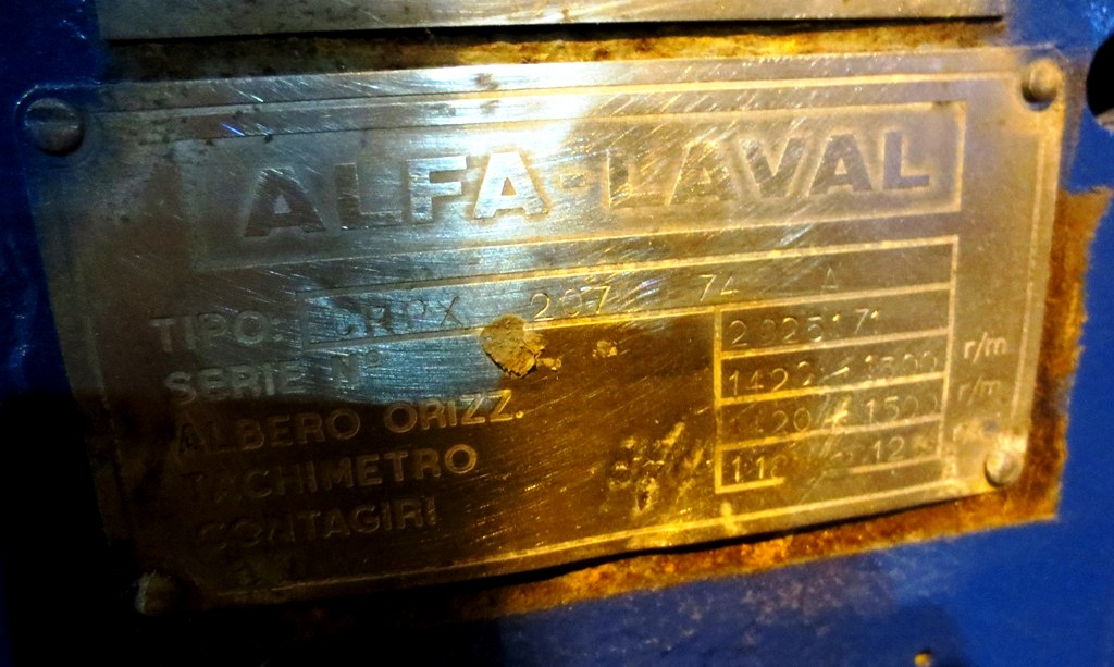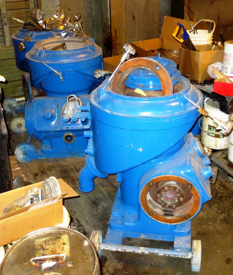 Max bowl speed 6300 RPM, rated @ 5570 LPH, both liquid phases discharged by gravity. MISSING MOTOR, no tools or controls. Very good condition.