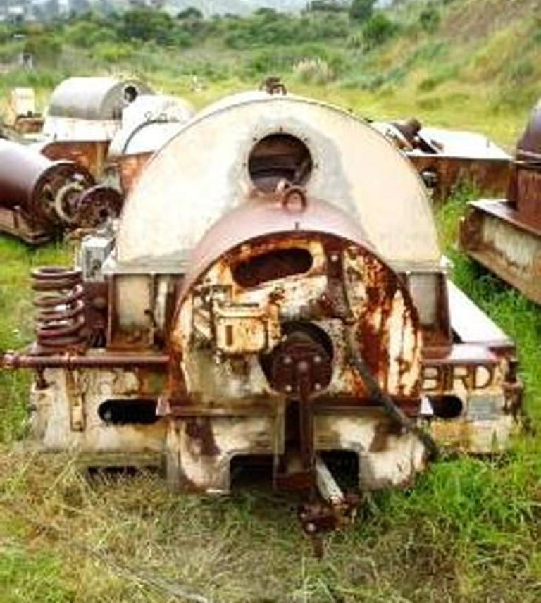 Max bowl speed 1600 RPM, 1422 x G, rated @ 8-25 TPH. Cyl/15/3 contour bowl, 5" single lead hardsurfaced conveyor, 100 HP motor 460/3/60/1800 RPM, SA-56 62:1 gearbox, guards, feed tube and lube system. 1960 vintage. Very good condition.