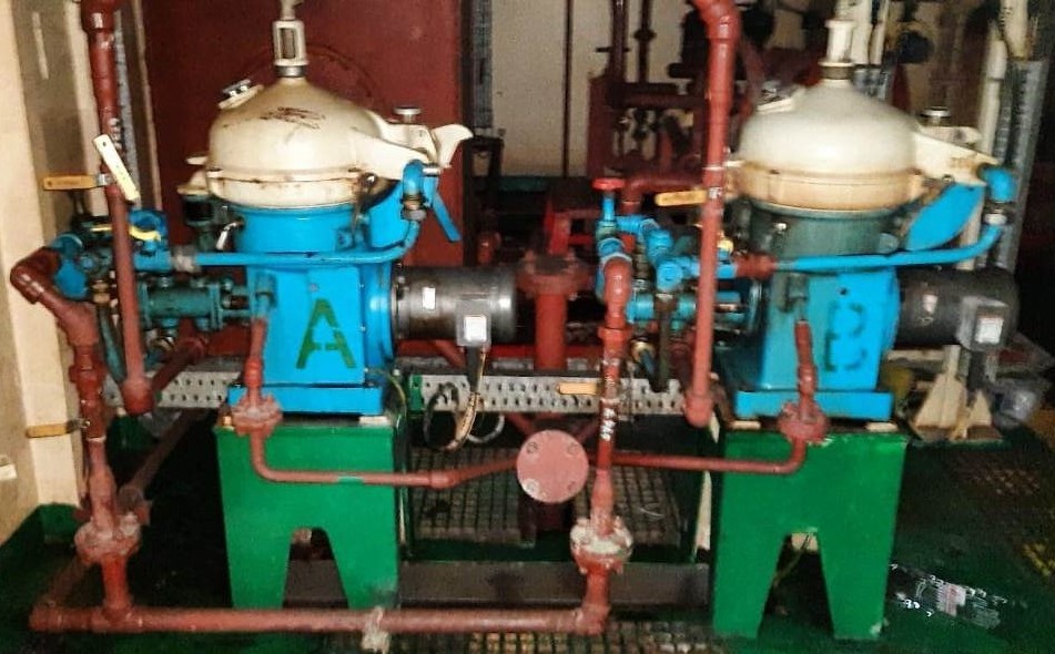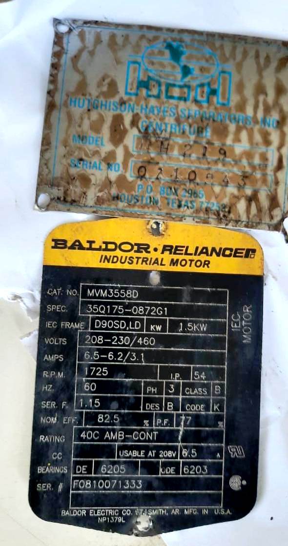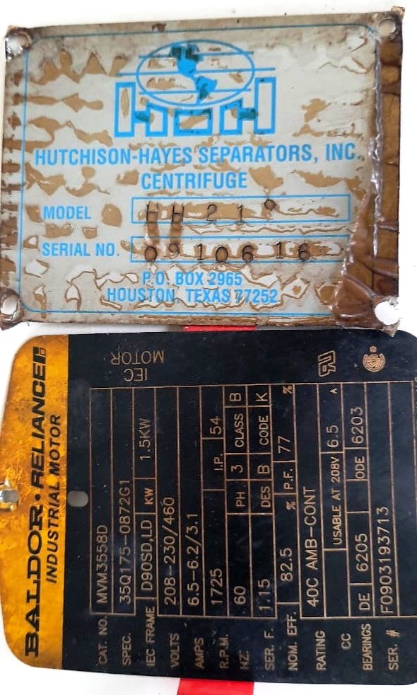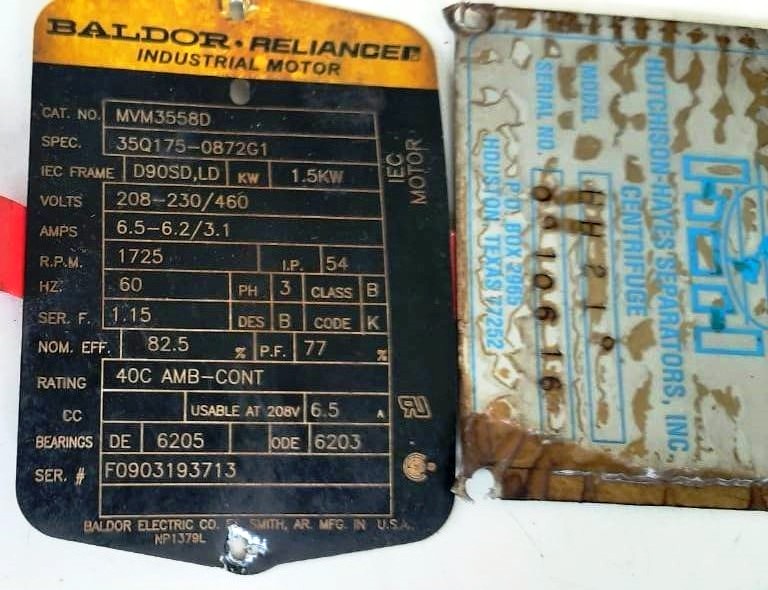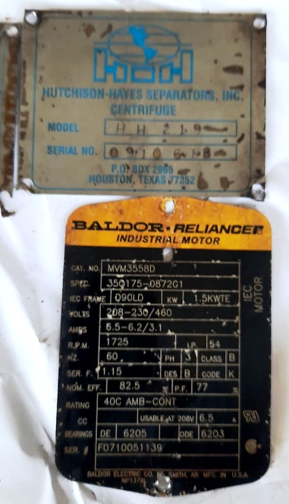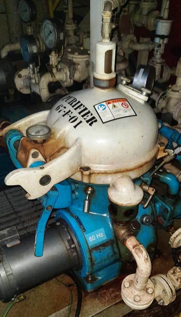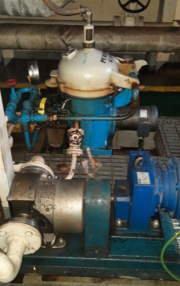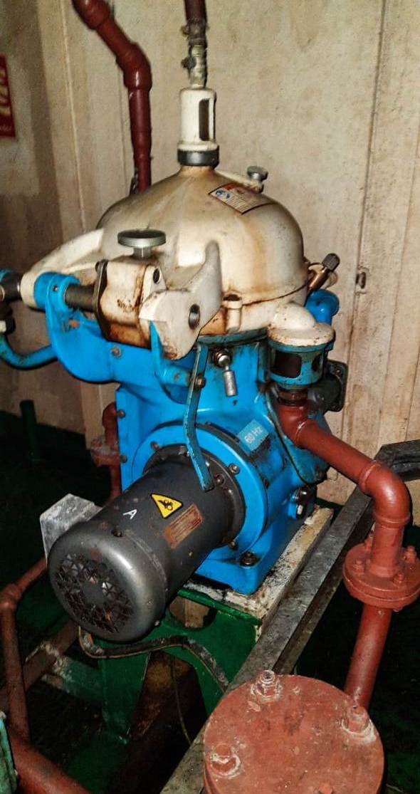 Max bowl speed 9200 RPM, rated @ 2100 LPH (9 GPM), 1.5 KW motor 230/460/3/60/1800 RPM, attached feed/light phase discharge pump, clean oil inspection glass and revolution counter, seal water inlet device, gravity rings and vibration dampeners. 2009 vintage. Very good condition. Located in Bangladesh. Equivalent to Alfa-Laval MAB 104B-24-60.
