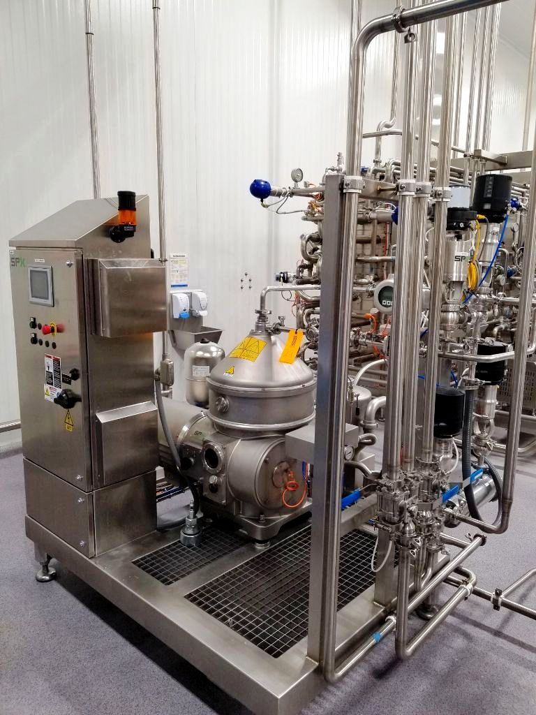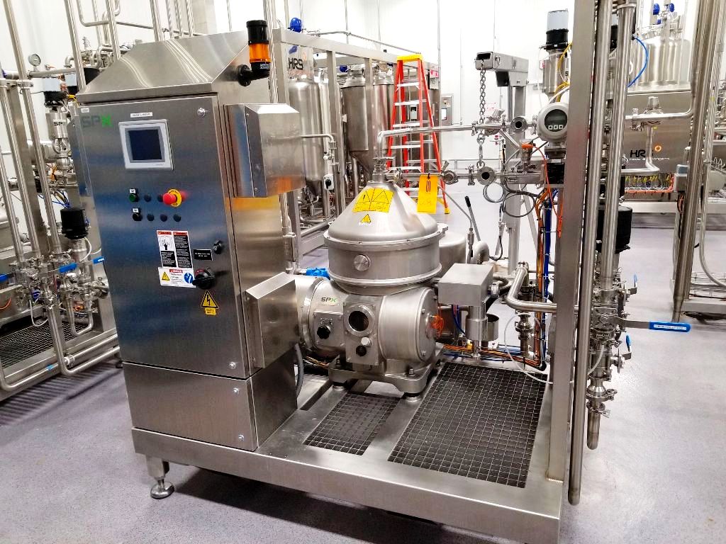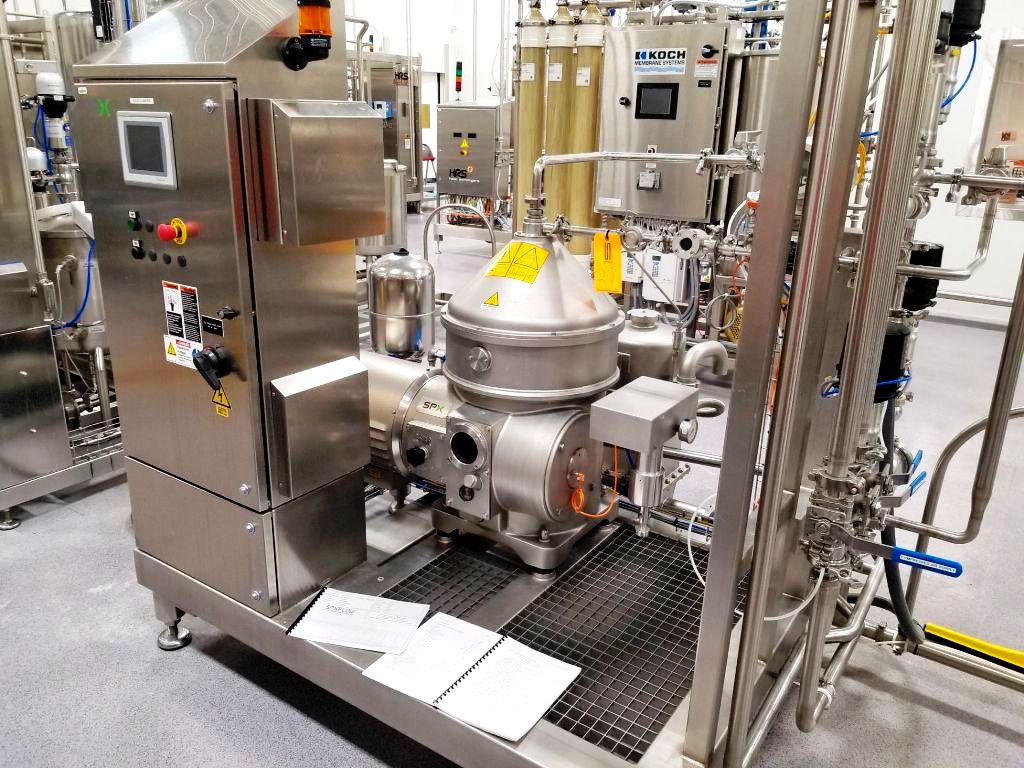 Max bowl speed 7500 RPM, rated @ 7000 LPH, self-cleaning. 7.5 KW motor 460/3/60/1750 RPM, surge tank, flow meter, manometer, valves, tools, PLC touch screen control panel with VFD, unitized on a SS skid. 2017 vintage. Excellent condition.