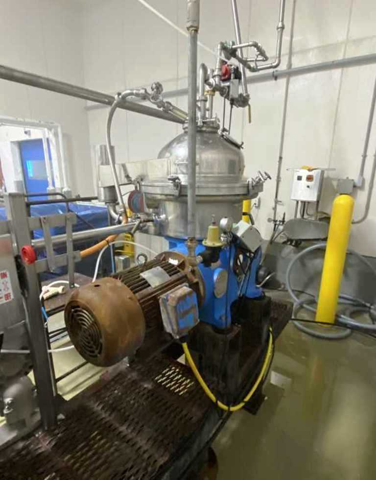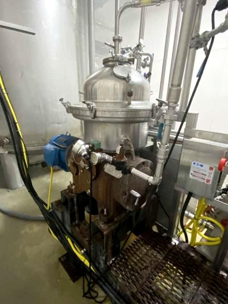 (4) Westfalia SA 20-03-076 separators, 316SS. are engineered for high-efficiency separation processes, making them an ideal choice for various industrial applications. With a maximum bowl speed of 6500 RPM, these separators are capable of handling a rated capacity of 12,000 liters per hour (LPH), ensuring that your operations can maintain high throughput levels. The heavy liquid phase is discharged under pressure, which not only enhances the efficiency of the separation process but also minimizes the risk of contamination. Powered by a robust 20 HP motor operating at 575 volts, 3-phase, and 60 Hz, these separators are designed for reliability and performance, even in demanding environments. The inclusion of a sludge cyclone further optimizes the separation process by effectively managing the sludge, ensuring that your system remains clean and operational without frequent downtime for maintenance.