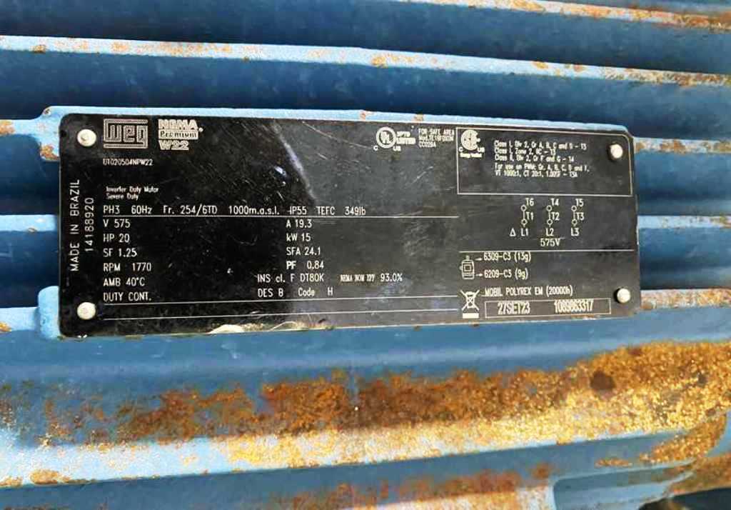 Max bowl speed 6500 RPM, rated @ 12,000 LPH, heavy liquid phase discharged under pressure, 20 HP motor 575/3/60/1770 RPM, sludge cyclone, tools and control panel. 1983 vintage. Very good condition. Located in Canada.