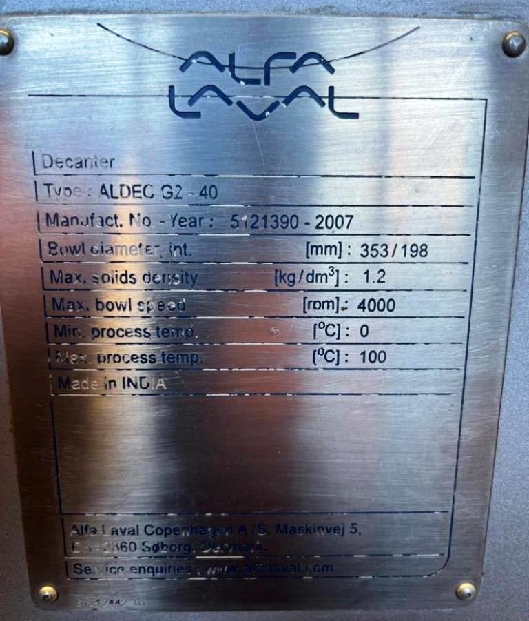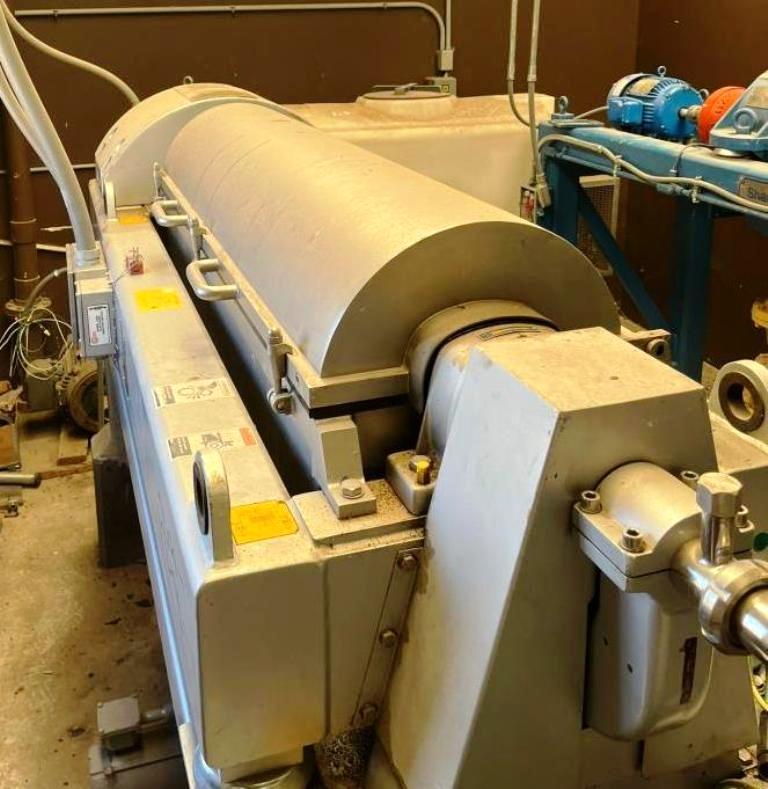 Max bowl speed 4000 RPM, 3158 x G, 6 degree beach, 360 degree cake ports, 110mm single lead TM42 hardsurfaced Esbjerg, 22 KW motor 380/3/50, 5.5 KW vari-speed backdrive, 1:57 3.5 kNm DD gearbox, guards, vibration switch/isolators, unitized on a stand. 2007 vintage. Very good condition.