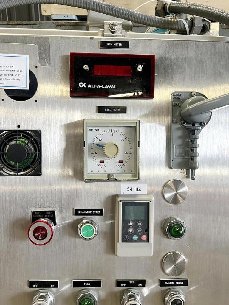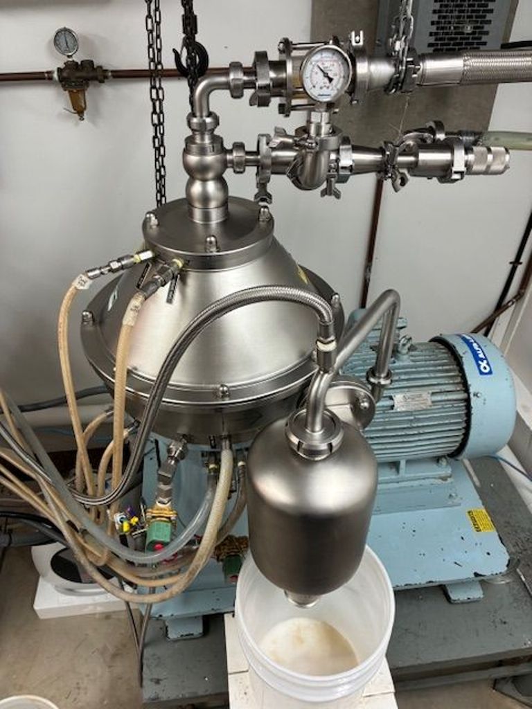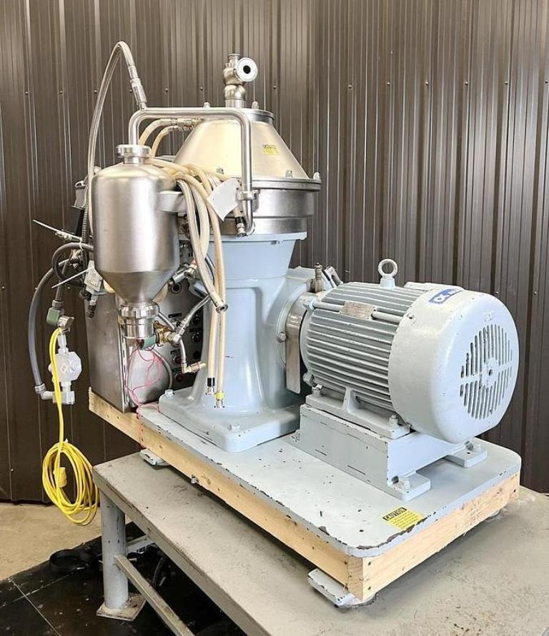 Max bowl speed 9650 RPM, 12,800 x G, steam sterilizable, gastight, liquid phase discharged under pressure, 7.5 HP XP motor 230/460/3/60/3490 RPM, sludge cyclone, piping, water harness and PLC control panel on a skid with tools and manuals. Very good condition. Located in Canada.