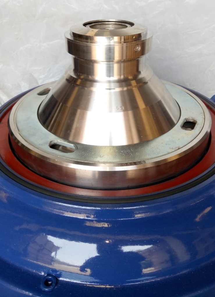 Max bowl speed 6400 RPM, light liquid phase discharged under pressure, rated @ 25 GPM. 7.5 KW motor 415/3/50/1450 RPM. Reconditioned and converted to concentrator design. Located in India.
