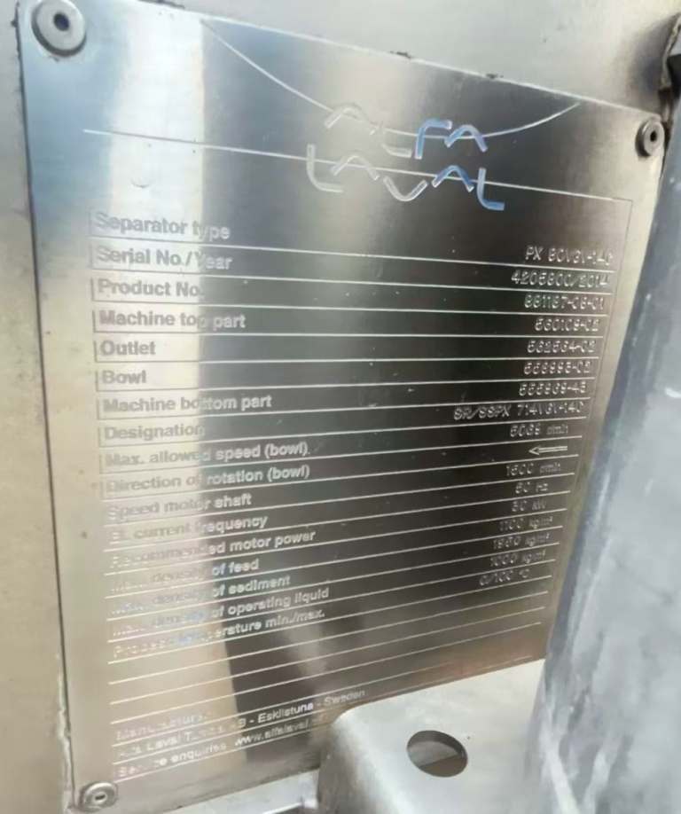 The Alfa-Laval PX 80-VGV-14C hermetic refining separator, 316SS, is engineered for optimal performance in various industrial applications, particularly in the food and beverage, pharmaceutical, and chemical sectors. With a maximum bowl speed of 5069 RPM, this separator is designed to efficiently process large volumes of liquid, rated at 18,000 liters per hour (LPH). The separator's ability to discharge the light phase under pressure enhances its operational efficiency, making it an ideal choice for facilities that require consistent and reliable separation processes. The robust 30 KW motor, operating at 380V/3/50/1460 RPM, ensures that the separator maintains high performance even under demanding conditions, providing users with peace of mind regarding its reliability and durability. This unit, manufactured in 2014, is in very good condition, making it a valuable addition to any production line looking to enhance its separation capabilities.