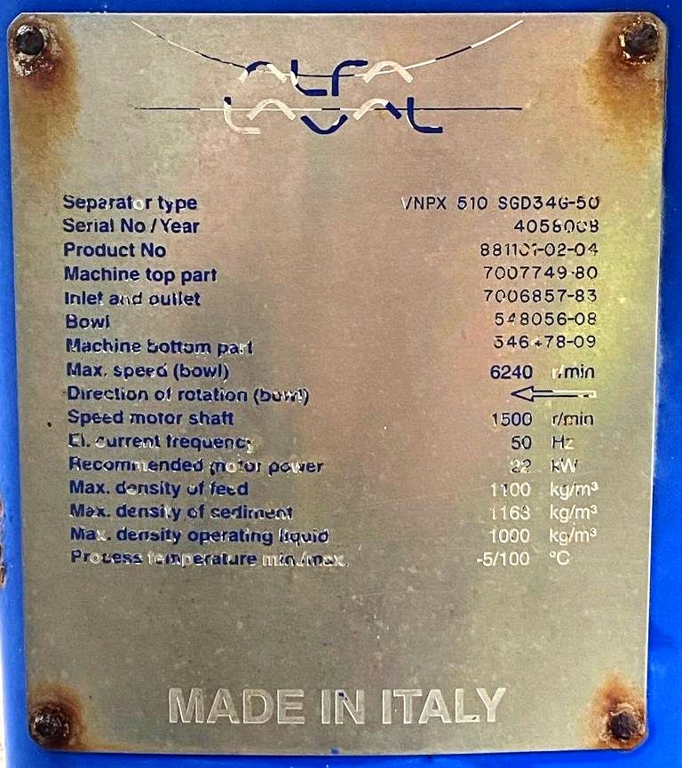 Max bowl speed 6240 RPM, timed solids discharge, liquid discharged under pressure, 22 KW motor 400/460/3/50/60, sludge cyclone, all valves, gauges, piping, feed pump, and control panel, unitized on a skid. 1992 vintage. Very good condition. Located in Australia.