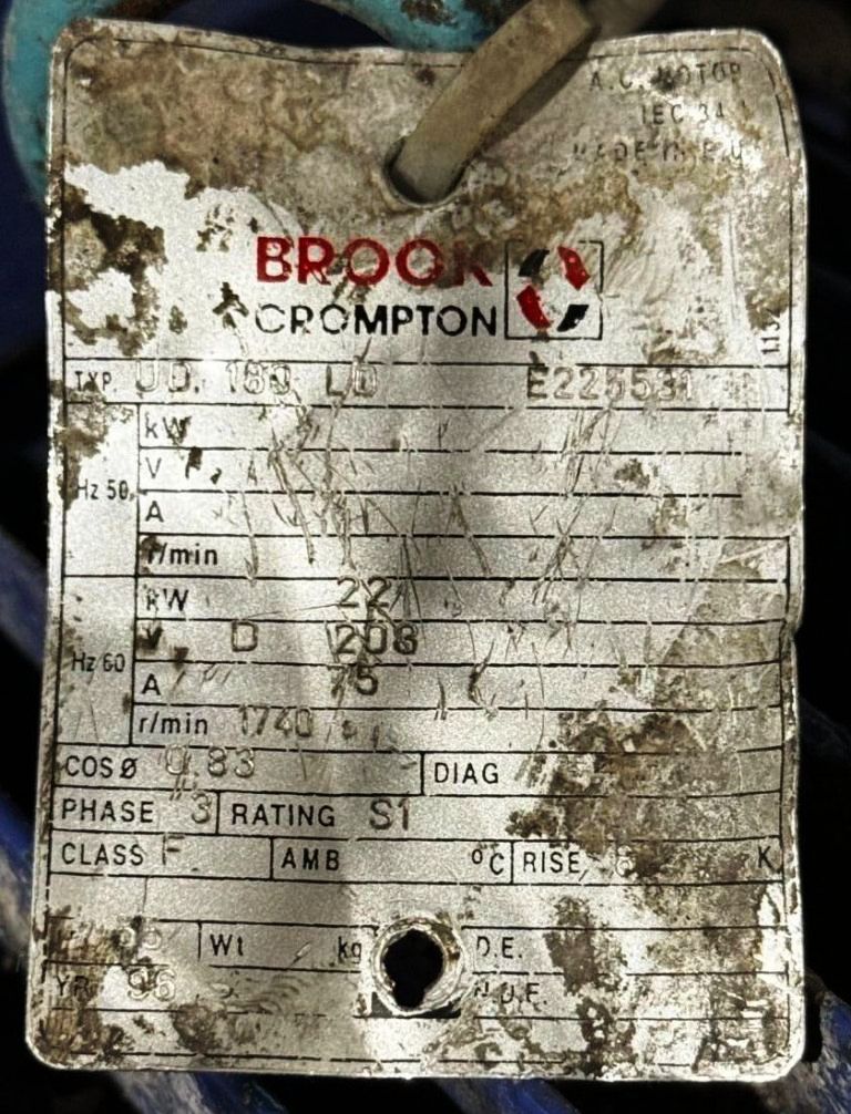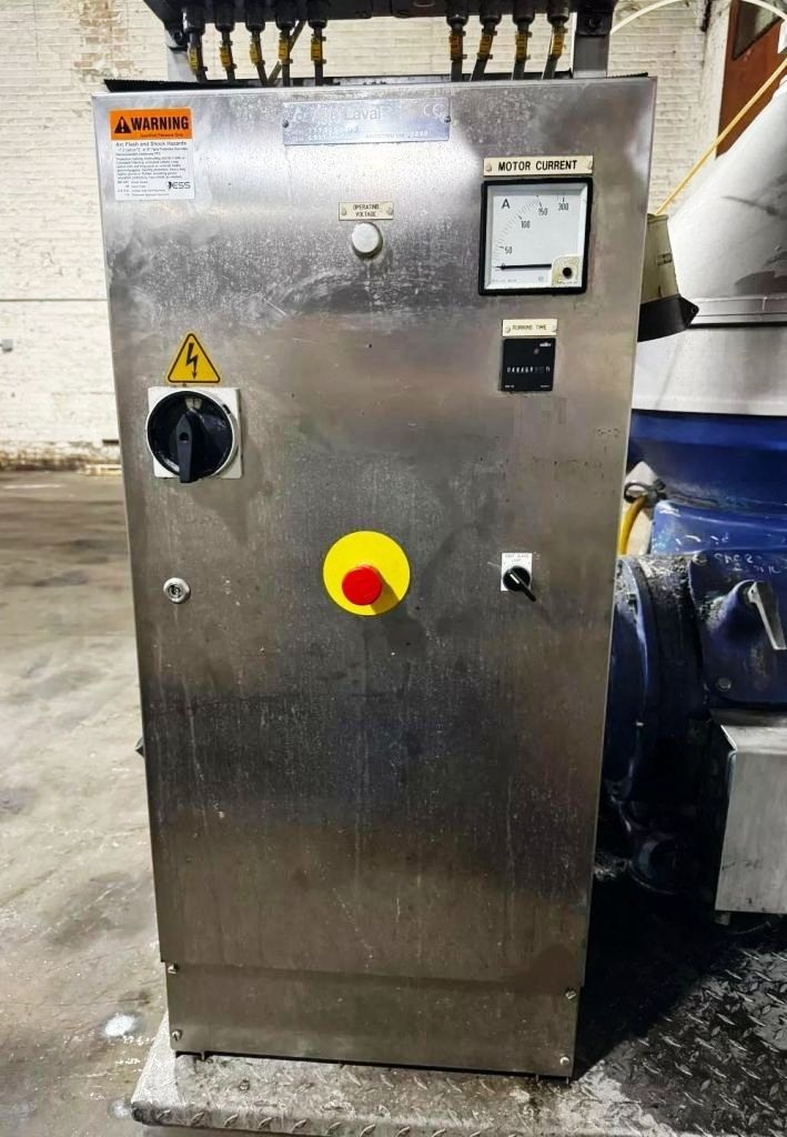 Max bowl speed 6235 RPM, timed solids discharge, liquid discharged under pressure, 22 KW motor 460/3/60/1750 RPM, sludge cyclone, all valves, gauges, piping, feed pump and control panel on a skid. 1996 vintage. Very good condition.