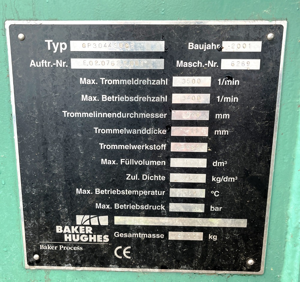 Max bowl speed 3500 RPM, 3080 x G, 18 x 72" bowl ID. 6" single lead STC-tiled conveyor, 30 KW motor 690/400/3/50/2930 RPM, Hiller hydraulic backdrive system with 11 KW motor, guard, feed tube and control panel with VFD. 2001 vintage. Very good condition. FCA Europe.