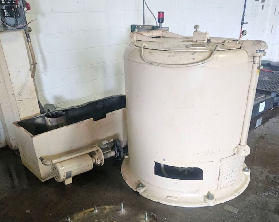 Max bowl speed 1200 RPM, 327 x G, 23 x 15" basket ID, 2.1 cuft capacity, (20) 225 LB loads/hr, 6 HP motor 230/460/3/60/3450 RPM, dynamic brake, timer control, lid lock, one basket and carrier. Includes coolant collection tank and sump pump. Very good condition.