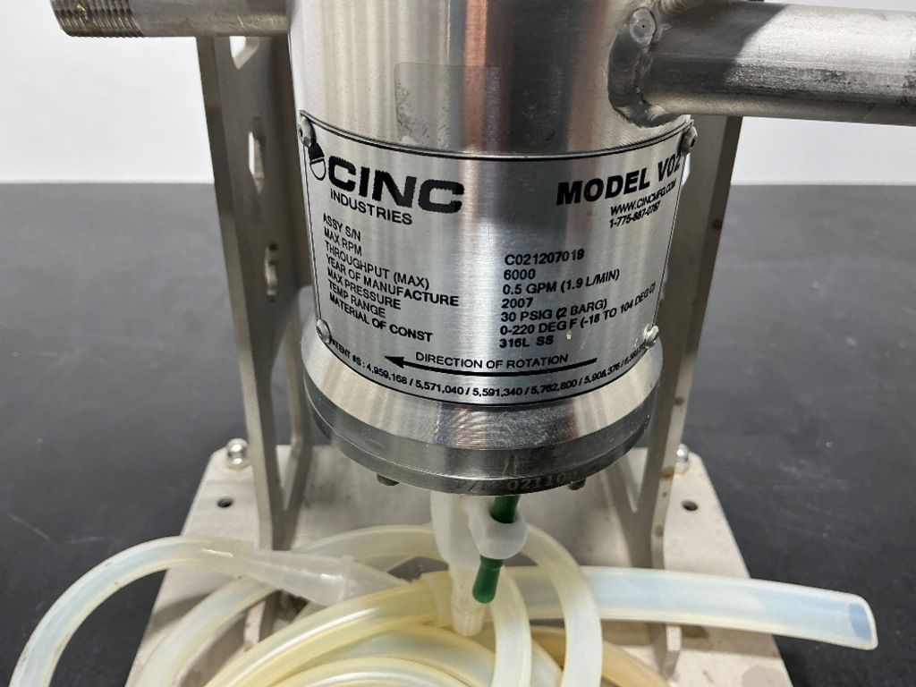 The CINC V02 annular centrifugal contactor, 316L SS. is engineered for high-efficiency liquid-liquid separation, making it an ideal choice for various industrial applications. With a maximum bowl speed of 6000 RPM, this contactor is capable of efficiently processing fluids at a rated capacity of 0.5 GPM (1.9 LPM, 114 LPH). The 50mm diameter rotor is designed to optimize the separation process, ensuring that the desired phases are effectively isolated. The unit is powered by a 0.18 KW explosion-proof (XP) motor, which is equipped with a variable frequency drive (VFD) for precise control over operational speed and performance. This feature not only enhances the efficiency of the separation process but also allows for adaptability to varying operational conditions, making it a versatile addition to any industrial setup.