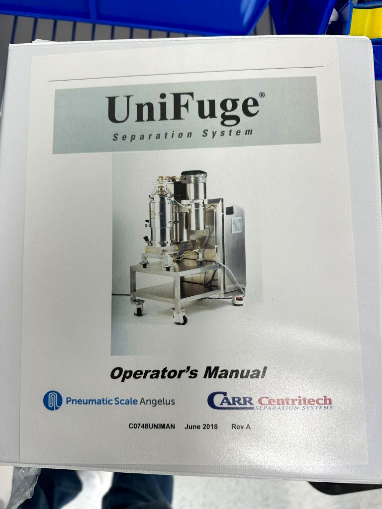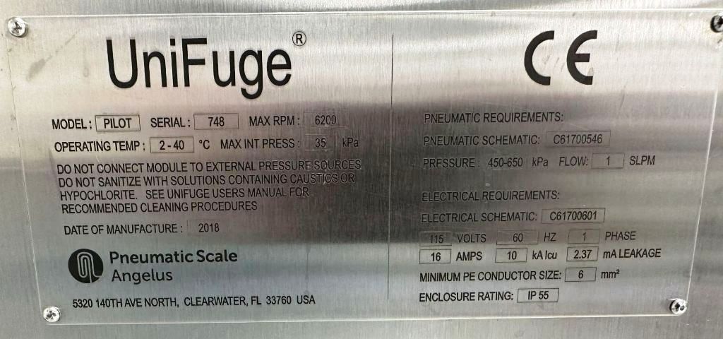The Carr Centritech UniFuge Pilot centrifuge, 316L SS., is engineered for high-performance applications in various industrial and laboratory settings. With a maximum bowl speed of 6200 RPM and a force of 4000 x G, this centrifuge is designed to efficiently separate components in a wide range of fluids. Its impressive rated flow capacity of 4 liters per minute ensures that it can handle substantial volumes, making it an ideal choice for pilot-scale operations. The unit’s bowl capacity of 950 ml or 1.8 liters further enhances its versatility, allowing users to process both small and larger batches with ease. Operating within a temperature range of 4-40°C, the UniFuge is suitable for sensitive materials that require precise temperature control during processing.