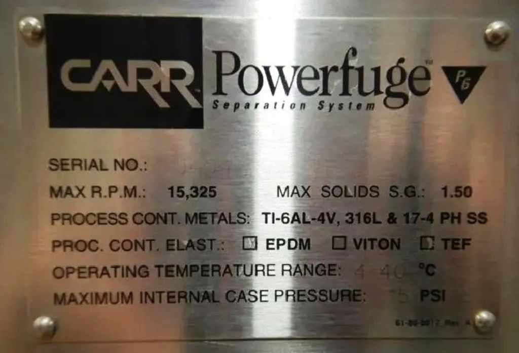 Max bowl speed 15,325 RPM, 20,000 x G, rated @ 60 LPH, bowl capacity 1 L. 316L SS construction with titanium bowl assembly, plow, 1.5 HP motor 230/1/60/3450 RPM, Allen-Bradley PanelView 550 PLC control panel with VFD, unitized on a skid with all piping, valves, manuals and separate CIP/SIP skid. Excellent condition.