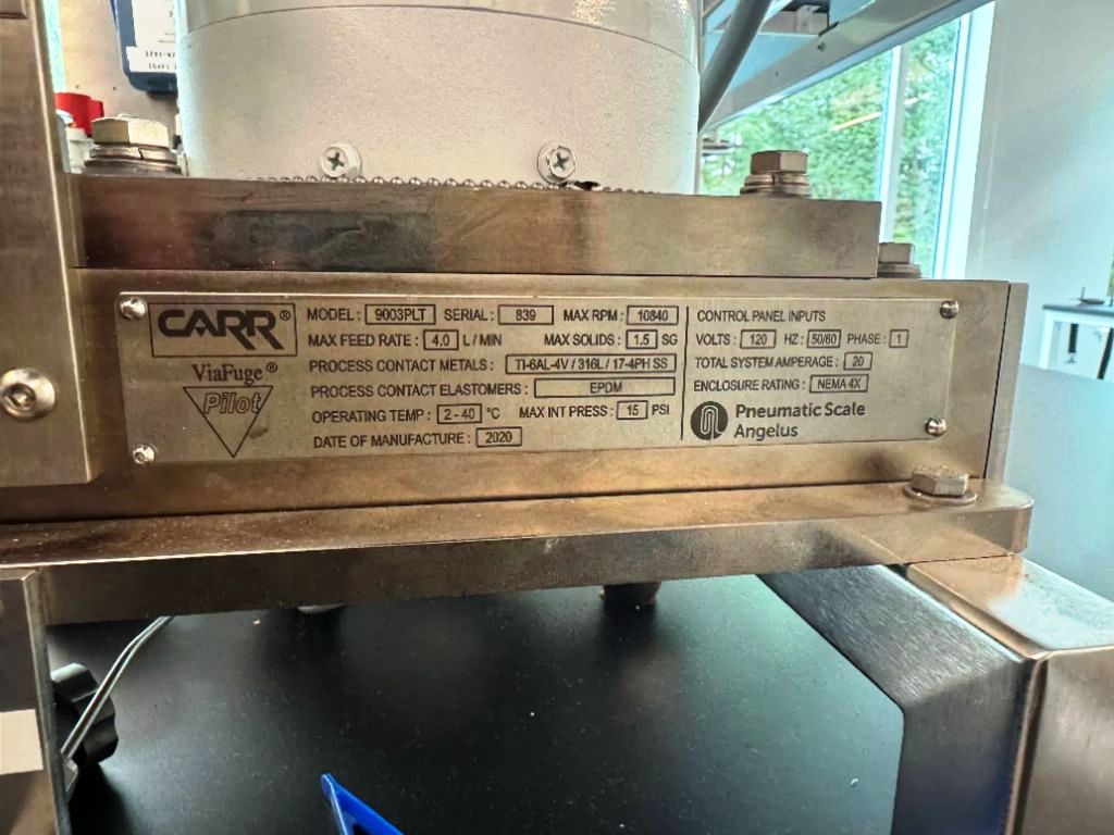 The Carr ViaFuge 9003 PLT Pilot clarifier centrifuge, 316L SS. is engineered for high-performance separation processes, making it an ideal choice for industries that require efficient liquid-solid separation. With a maximum bowl speed of 10,840 RPM, this centrifuge is capable of achieving a rated throughput of 240 liters per hour, ensuring rapid processing of materials. The robust construction utilizing 316L stainless steel not only provides excellent corrosion resistance but also enhances the durability of the unit, allowing it to withstand harsh operating conditions. The titanium bowl assembly further contributes to its longevity and reliability, making it suitable for a variety of applications, including pharmaceuticals, food processing, and chemical manufacturing.
