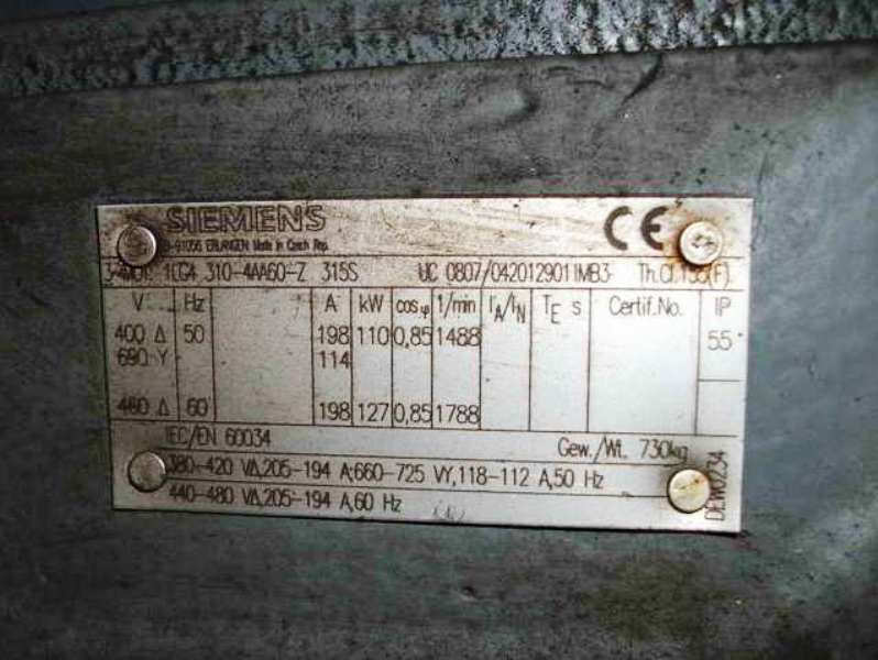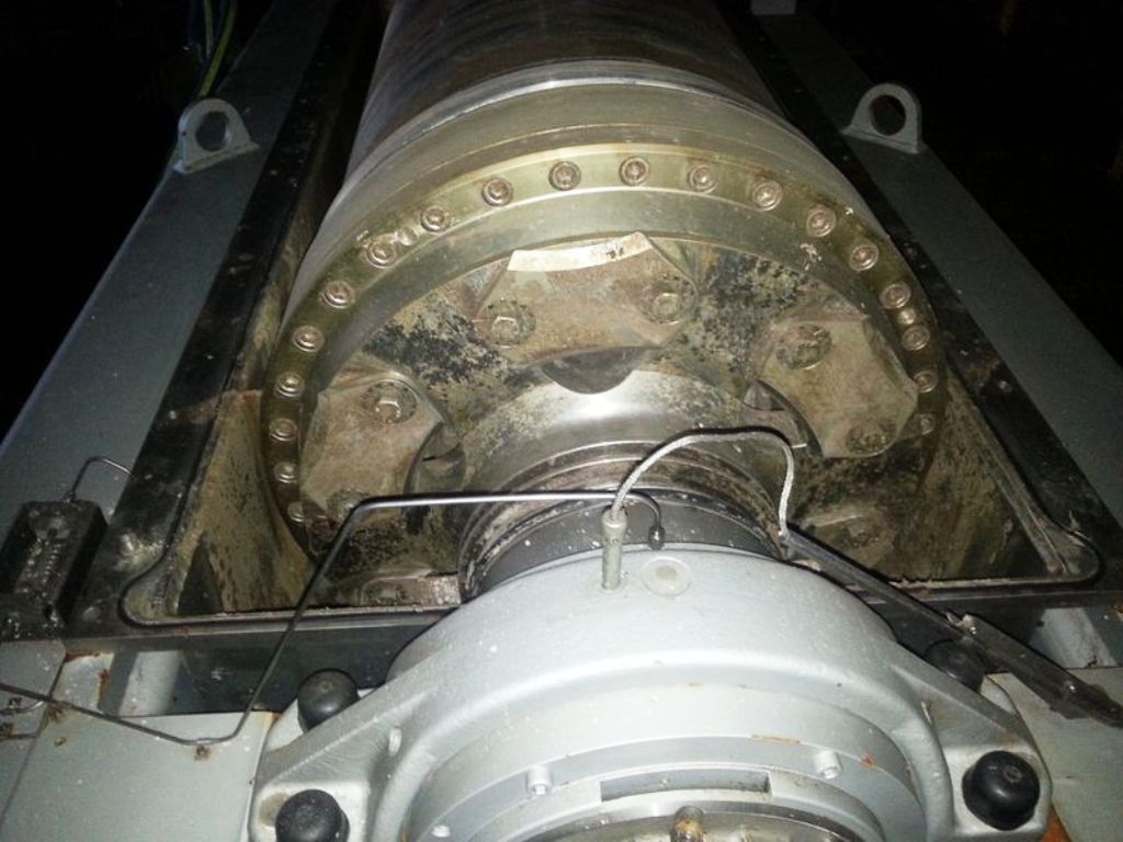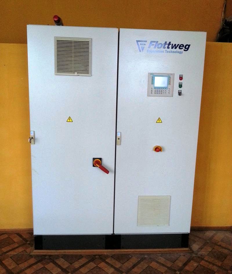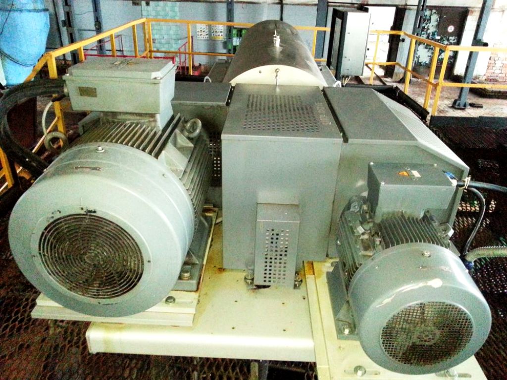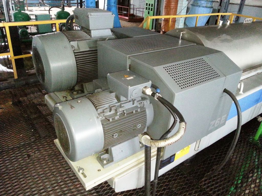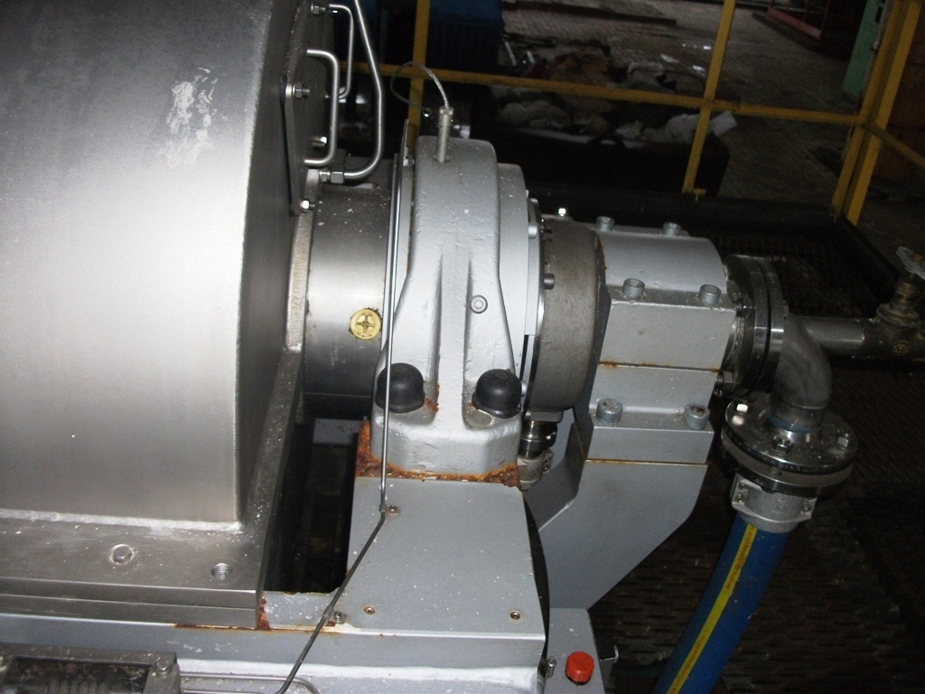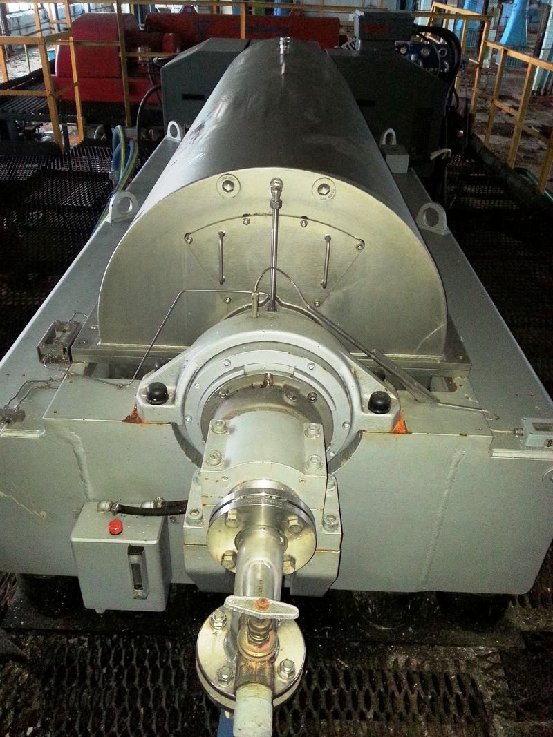 Max bowl speed 3200 RPM, 3530 x G, 17 degree beach angle. 10" single lead TC hardsurfaced conveyor and cake ports, bearing lube oil system, 110 KW motor 400/690/3/50/1450 RPM, 37 KW backdrive, VFD on both drives, SP 3.12 gearbox, SIMP gear scroll technology with SIMP control, guards, feed tube, vibration switch/isolators, chutes and PLC control panel. Prior use: DDGS. 2008 vintage. Excellent condition. FCA Europe.