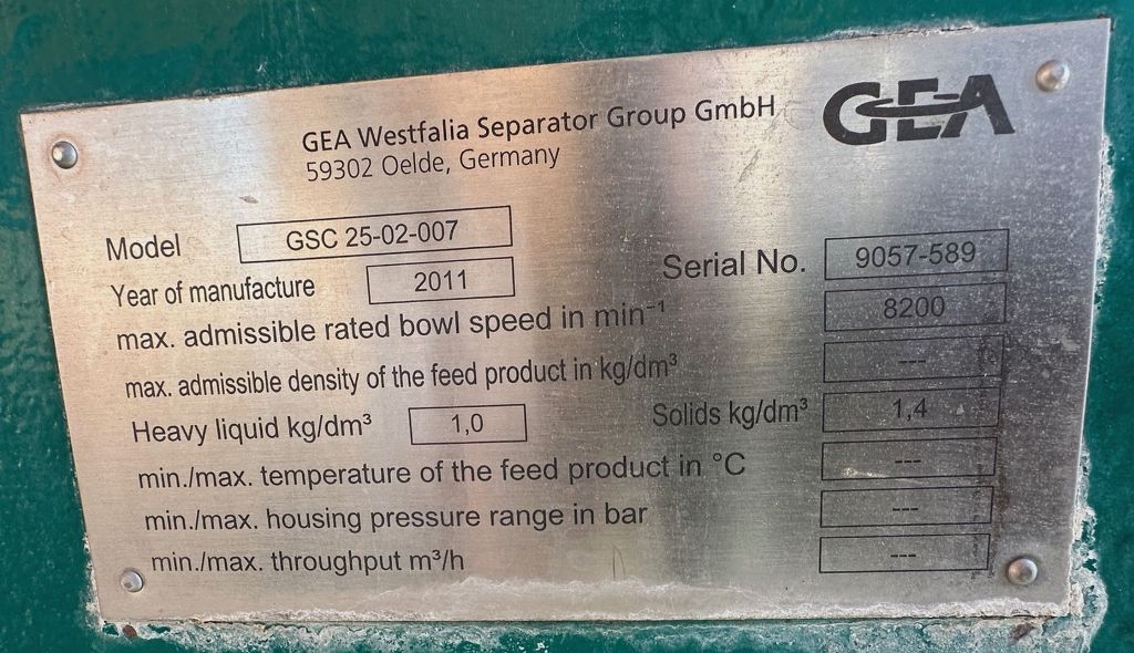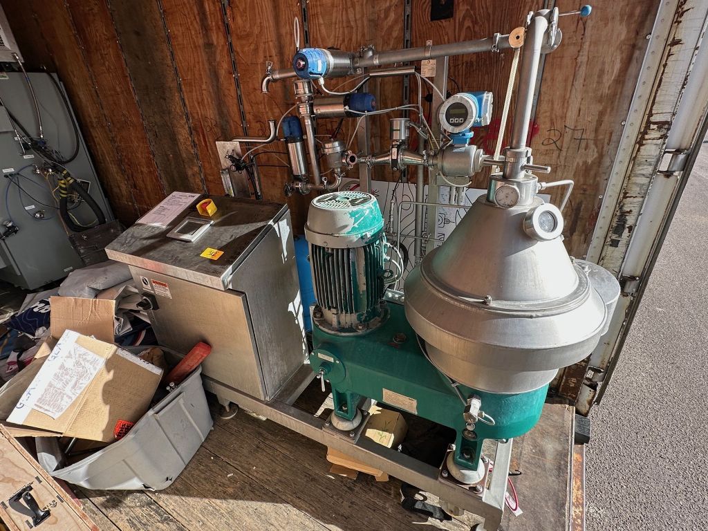 Max bowl speed 8200 RPM, 10,000 x G, rated @ 12,000 LPH, 4 L solids space, 6 bar pressure. Hydrohermetic product feed, hydry ejection system, light liquid phase discharged via centripetal pump, 15 KW motor 460/3/60/1750 RPM, solids cyclone, turbidity meter, feed and solids pumps, tools, spares and control panel. Unitized on a portable skid. Prior use: Craft brewery. 2011 vintage. Excellent condition. Equivalent to: Equivalent to: HB05-SL Plug & Brew 100.