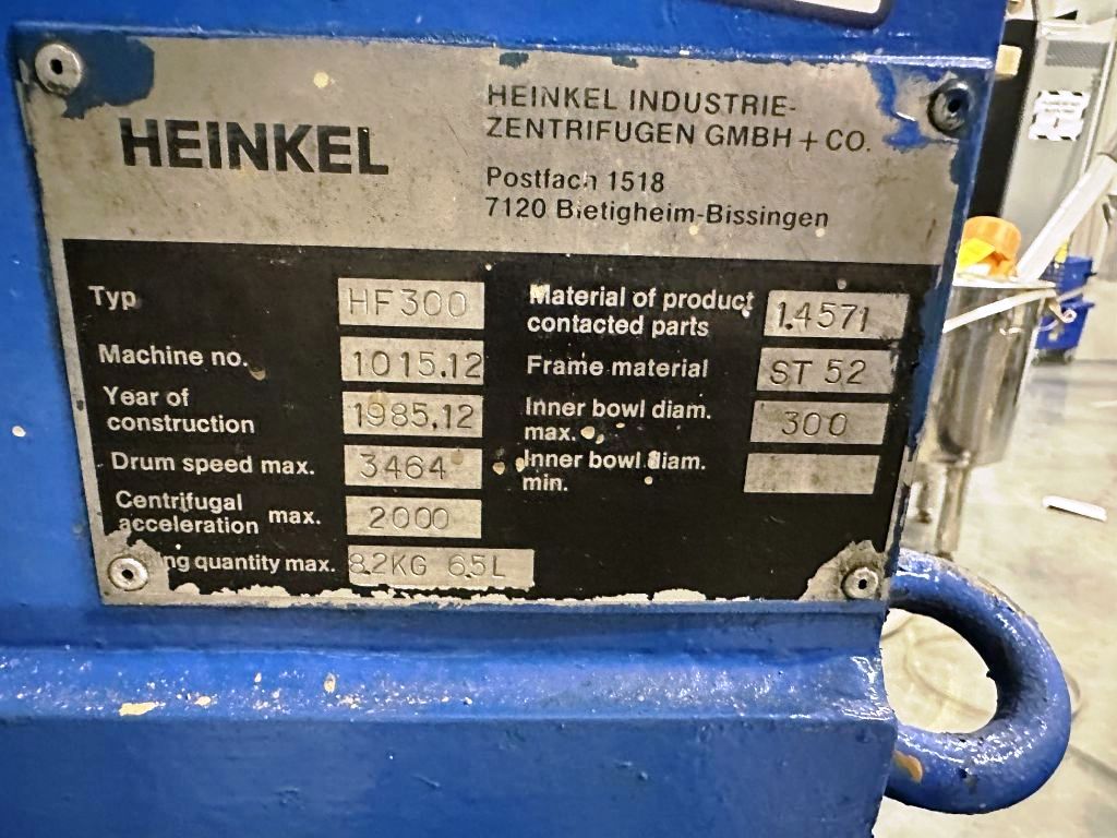 Equipped with a powerful 4 KW XP hydraulic motor operating at 460/3/60/3600 RPM, the Heinkel HF 300 provides the necessary torque to handle various materials effectively. The inclusion of a 1 KW XP pump motor and control panels further enhances the operational efficiency, allowing for precise control over the filtration process. This centrifuge, dating back to 1985, has been meticulously maintained and is in excellent condition, reflecting its reliability and the quality of engineering that Heinkel is known for. The design of the Heinkel HF 300 not only facilitates easy operation but also simplifies maintenance, ensuring that downtime is minimized and productivity is maximized. Its advanced features make it an ideal choice for industries that demand high-performance filtration solutions.