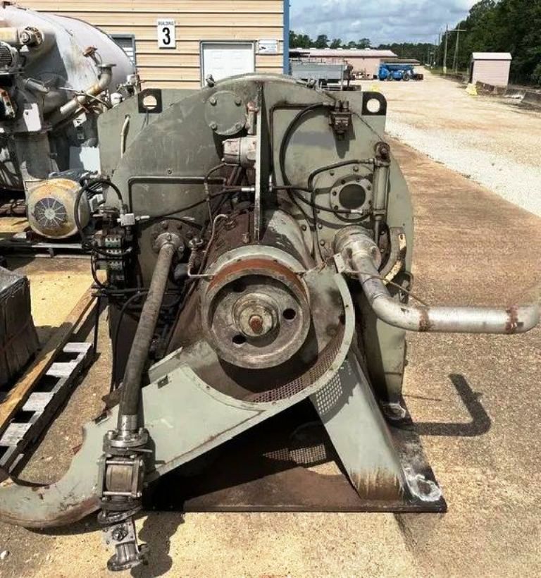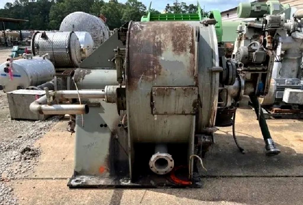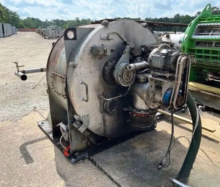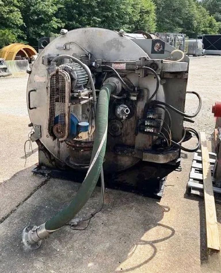 Max bowl speed 1150 RPM, 925 x G, 1250 x 630mm basket ID, siphon design, 2.46 sqM filtration area, 323.6 L volume, 433 kg max load. 60 HP XP motor 460/3/60/1775 RPM, feed and wash pipes, broad knife plow, discharge screw, gas purging of bearing seals, door interlock, speedometer, vibration monitor, hydraulic power pack with 2 HP motor, oil lubrication system. Prior use: Pharmaceutical. 1991 vintage. Very good condition.