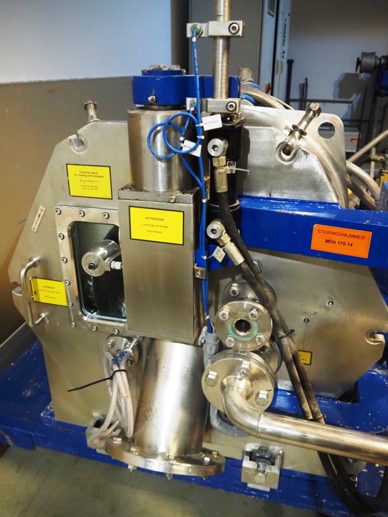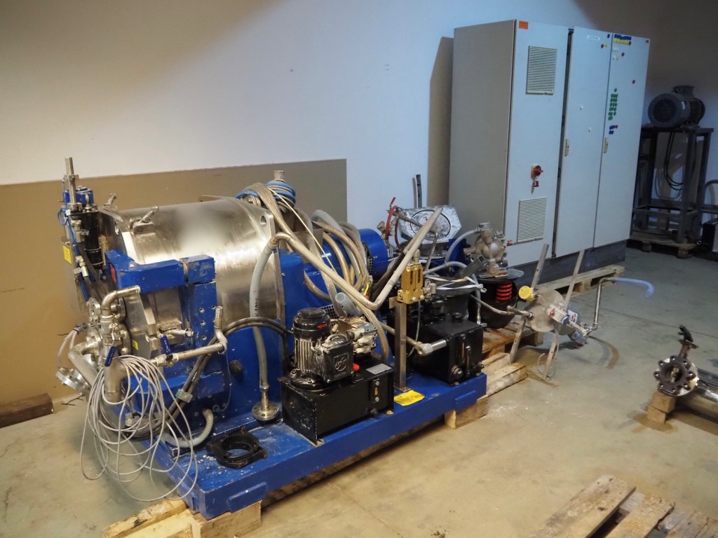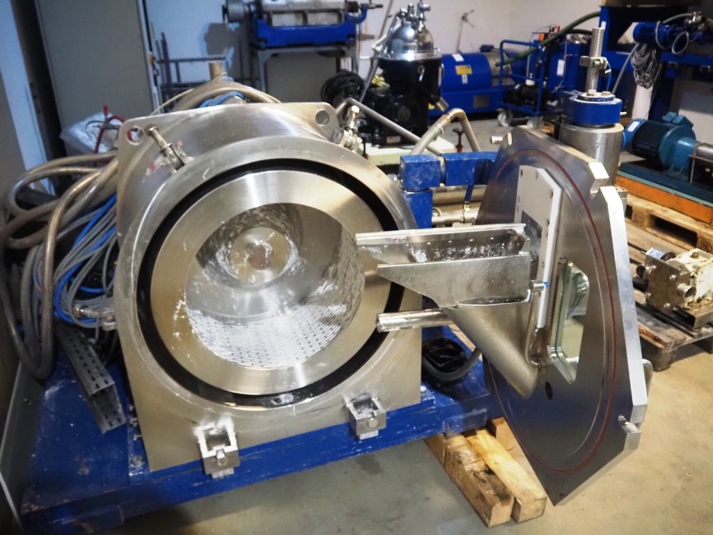 Max bowl speed 3000 RPM, 3170 x G, 630 x 370mm perforate basket ID, 0.73 sqM filtration area, 47.7 L volume, max load 63 kg. 22 KW motor 380/3/50/1455 RPM, belt guard, feed and wash pipes, broad knife plow, discharge screw, gas purging of bearing seals, door interlock, sight glass, speedometer, vibration monitor, constant temperature circulating bath, oil lubrication system, mounted on inertia base with vibration isolators, touch screen controller and PLC control panel with VFDs. 2011 vintage. Excellent condition. Located in Europe.