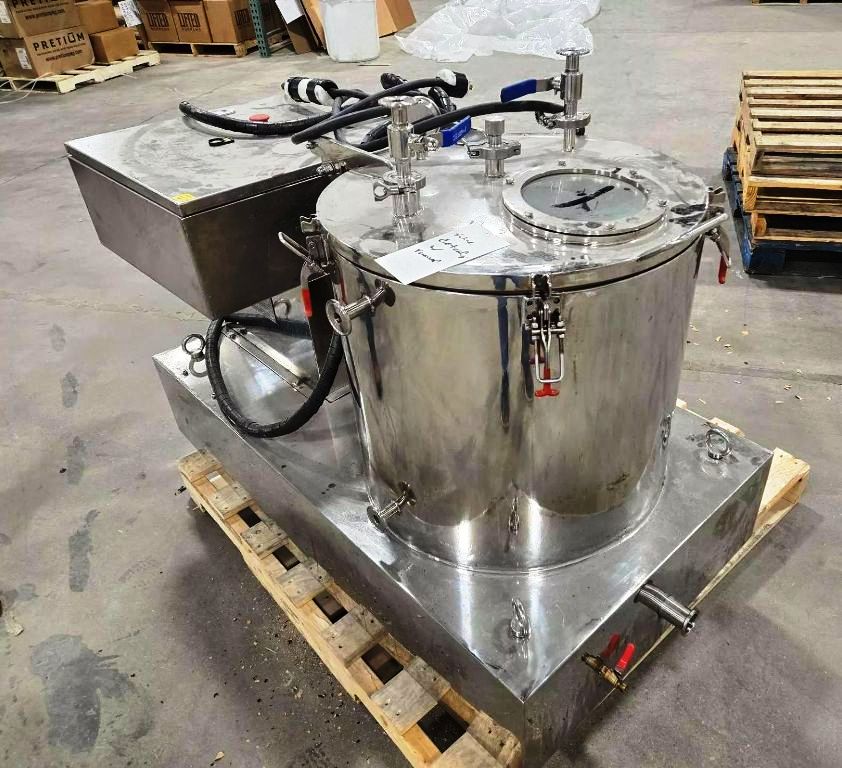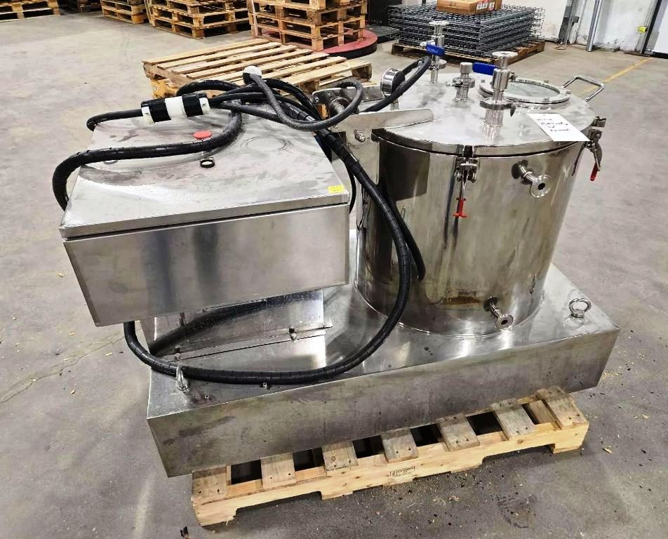 Max bowl speed 1500 RPM, 756 x G, 600 x 300mm basket ID, rated @ 12 kg biomass per batch, 60 L cake volume, low temp -50C max, sanitary design, vacuum jacketed insulation layer, 3 KW XP motor 460/3/60, reinforced sight glass, tri-clamp fittings for feed and drain ports, skid-mounted with vibration isolators and control panel with VFD. 2021 vintage. Very good condition.