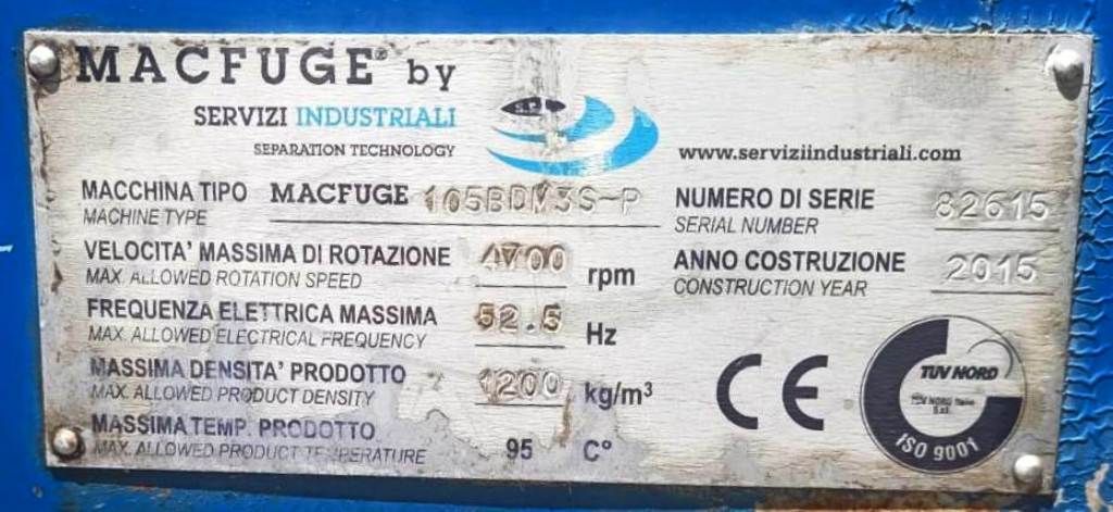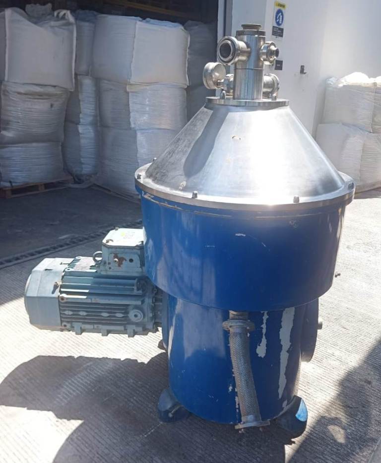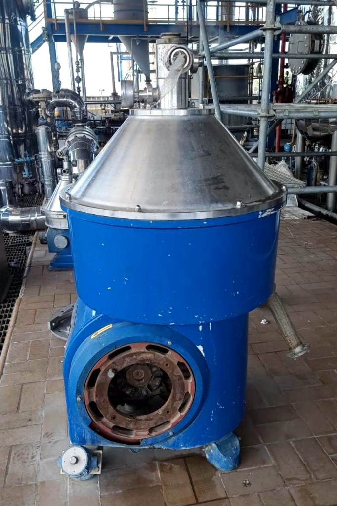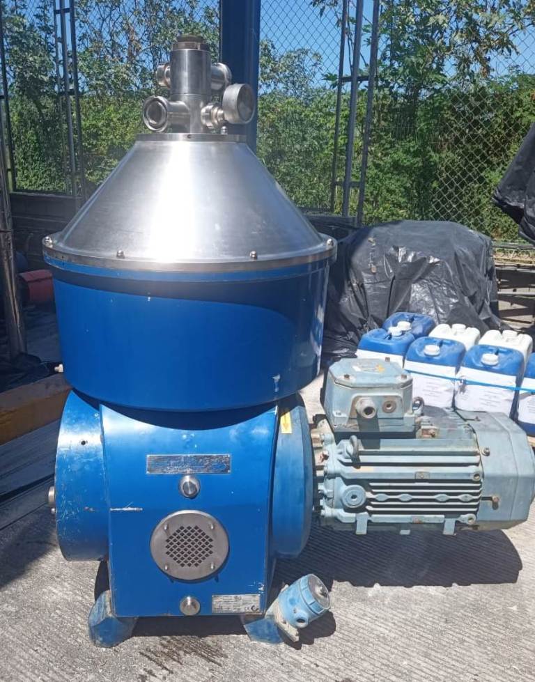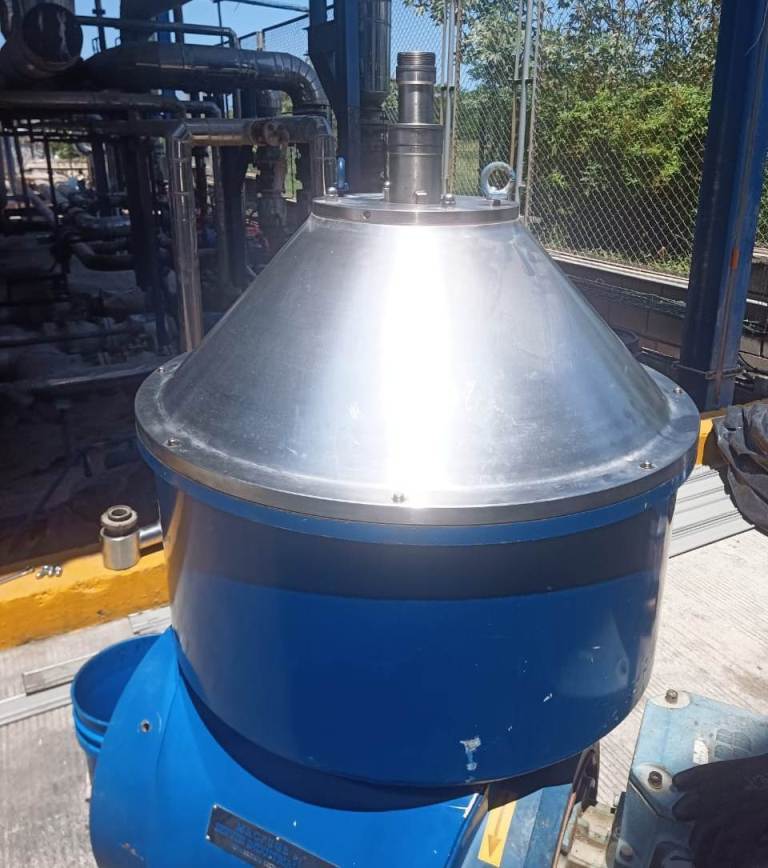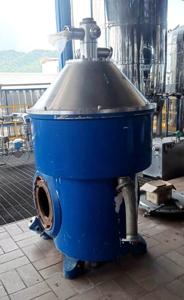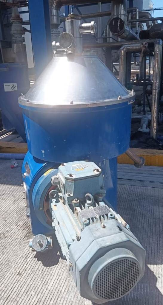 Max bowl speed 4700 RPM, rated @ 350-400 TPD (19 m³/hr) for final biodiesel washing and glycerol residue removal, sludge volume 45 L, both liquid phase discharged under pressure. 18.5 KW motor 440/3/60/1774 RPM. 2005 vintage. Very good condition. Located in South America.