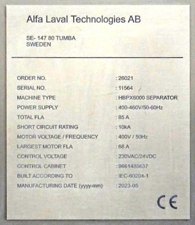 Equipped with a powerful 37 KW motor, the Alfa-Laval HBPX 6000 operates at a voltage of 400/690V and a frequency of 50Hz, providing robust performance for continuous operation. The inclusion of a sludge cyclone and water harness further optimizes the separation process by effectively managing waste and ensuring that the system remains clean and efficient. The entire setup is mounted on a stainless steel skid, which enhances durability and facilitates easier installation and mobility within your facility. Additionally, the PLC control panel with a variable frequency drive (VFD) and touch screen human-machine interface (HMI) allows for precise control and monitoring of the separation process, ensuring that operators can easily adjust parameters to meet specific operational requirements. This unit, being a 2023 vintage and never used, represents a unique opportunity to acquire state-of-the-art technology that is ready to enhance your operational capabilities.
