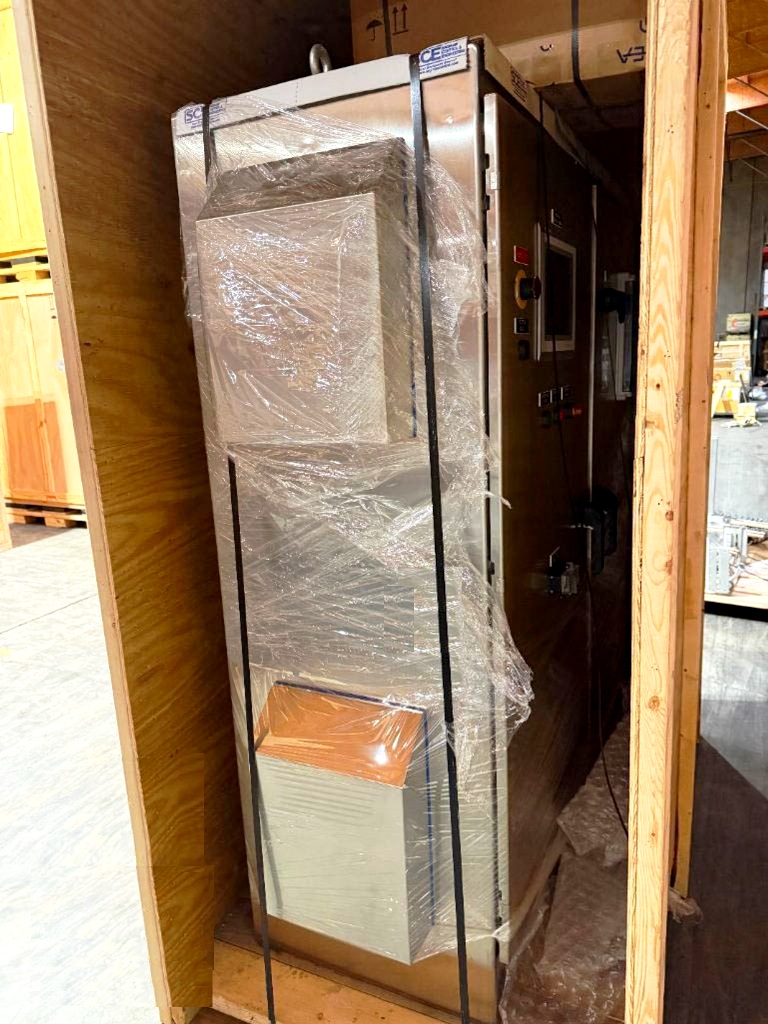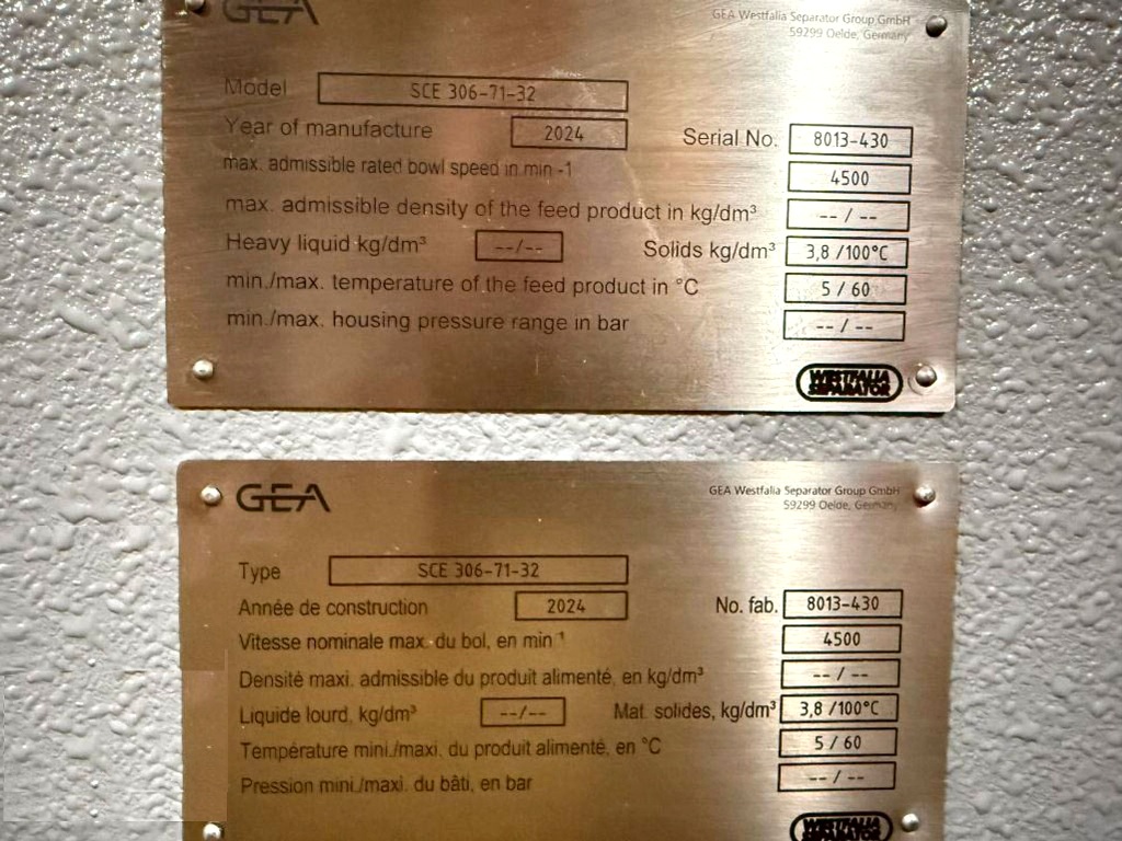 Equipped with a powerful 15 KW motor and a cyclo gearbox, the Westfalia SCE 306-71-32 ensures smooth and efficient operation. The inclusion of a 2.2 KW backdrive adds an extra layer of reliability, allowing for controlled operation and easy maintenance. Safety and user-friendliness are prioritized with the installation of guards, feed tubes, and chutes, all mounted on an integrated stand. The advanced PLC control panel, featuring variable frequency drives (VFDs) and an Allen-Bradley PanelView Plus touch screen HMI, provides operators with intuitive control and monitoring capabilities. This centrifuge is a 2024 vintage model that has never been used and remains in its original crates, ensuring that it is in pristine condition and ready for immediate deployment in your facility.