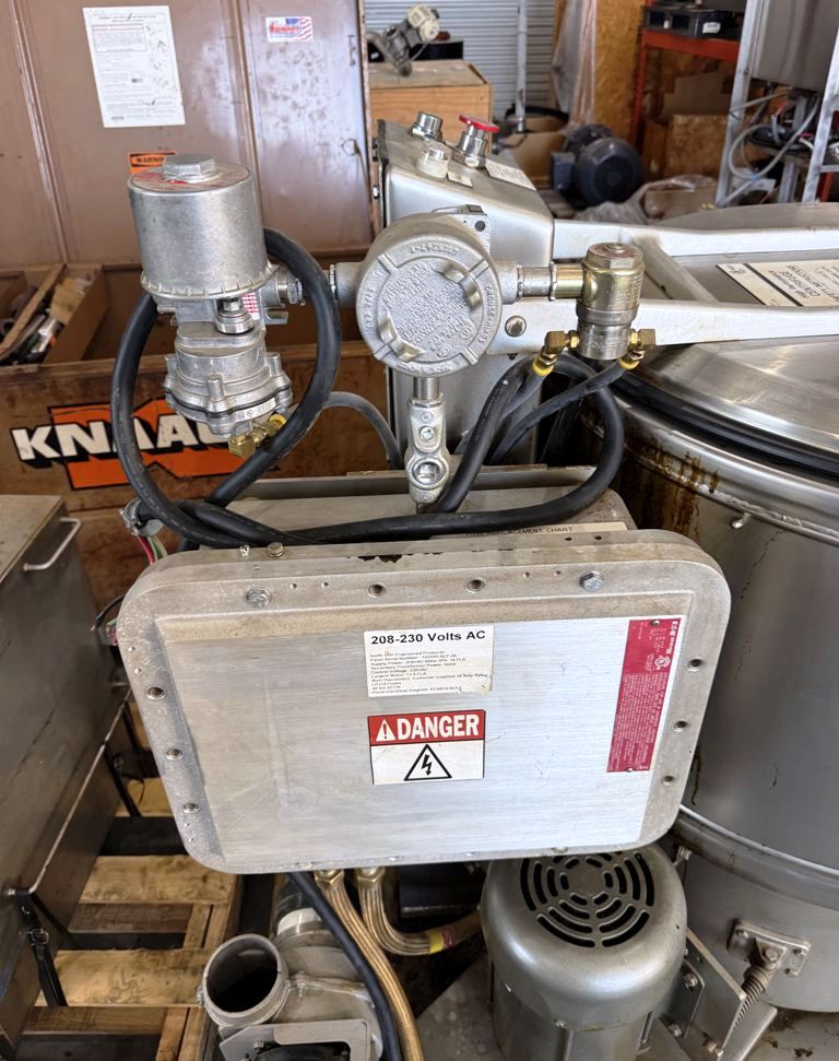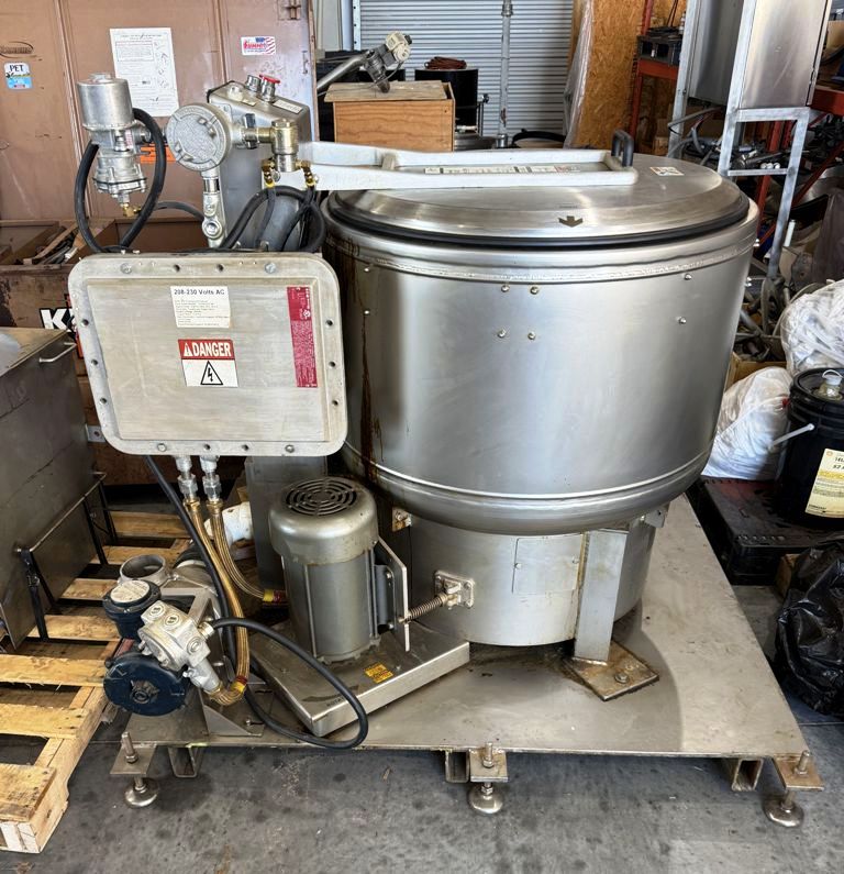 Max bowl speed 1740 RPM, 1200 x G, 6.54 cu ft/100 lbs capacity, 30 x 16" basket ID. 5 HP XP motor 480/3/60/1800 RPM, fume purge system and XP timer controls, mounted on a SS skid. 2019 vintage. Excellent condition.
