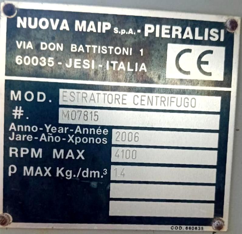 The (10) Pieralisi FP 600 RS decanter centrifuges, 316SS. are engineered for optimal performance in the extraction of olive oil, ensuring high efficiency and reliability in your production line. With a maximum bowl speed of 4100 RPM and a centrifugal force of 3318 x G, these centrifuges are capable of processing up to 6000 liters per hour (LPH) of olives. The bowl dimensions of 353 x 1228 mm (13.9 x 48.3 inches) provide ample space for effective separation, making them an ideal choice for medium to large-scale operations. The robust 11 KW motor operates at 380/3/50/1450 RPM, delivering consistent power and performance, while the planetary gearbox ensures smooth operation and longevity of the equipment. The inclusion of a 4 KW scraper motor enhances the efficiency of the separation process, allowing for optimal extraction rates with minimal waste.