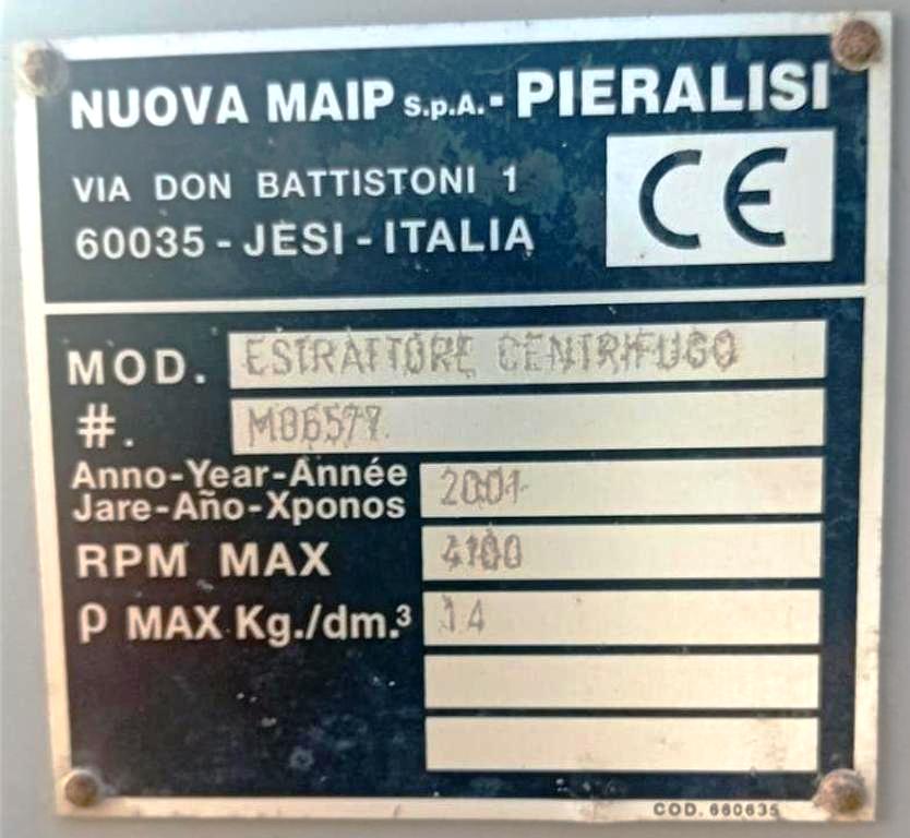 The (10) Pieralisi FP 600 RS decanter centrifuges, 316SS. are engineered for optimal performance in the extraction of olive oil, ensuring high efficiency and reliability in your production line. With a maximum bowl speed of 4100 RPM and a centrifugal force of 3318 x G, these centrifuges are capable of processing up to 6000 liters per hour (LPH) of olives. The bowl dimensions of 353 x 1228 mm (13.9 x 48.3 inches) provide ample space for effective separation, making them an ideal choice for medium to large-scale operations. The robust 11 KW motor operates at 380/3/50/1450 RPM, delivering consistent power and performance, while the planetary gearbox ensures smooth operation and longevity of the equipment. The inclusion of a 4 KW scraper motor enhances the efficiency of the separation process, allowing for optimal extraction rates with minimal waste.