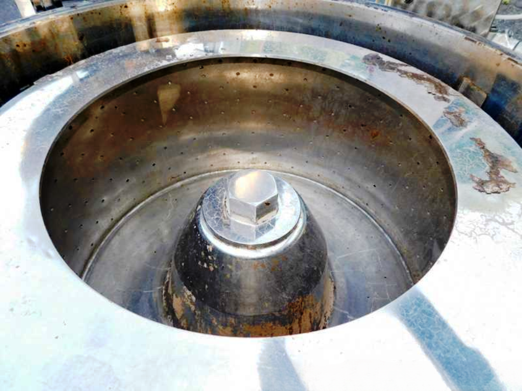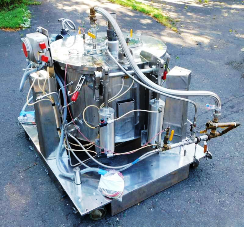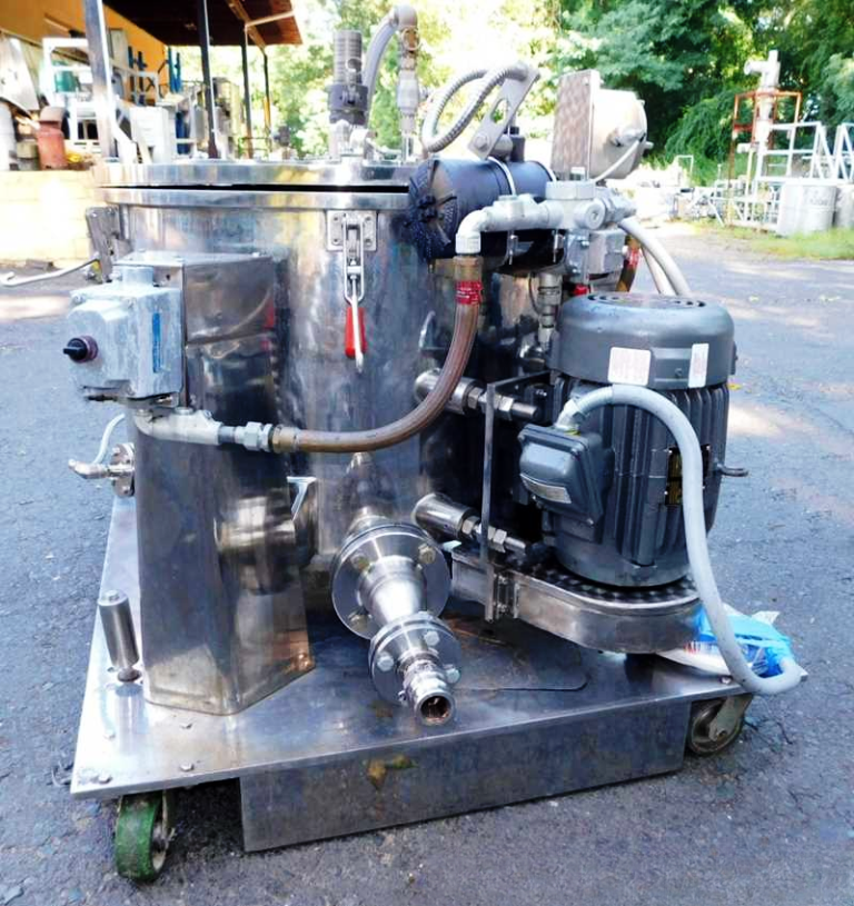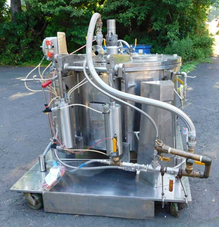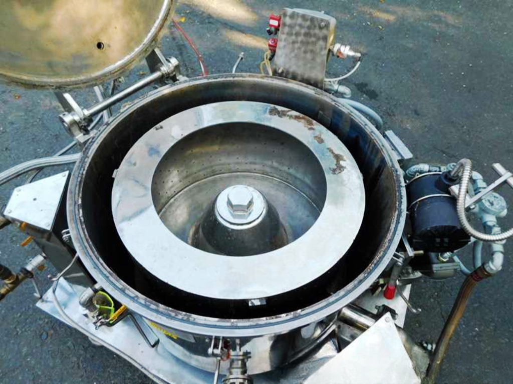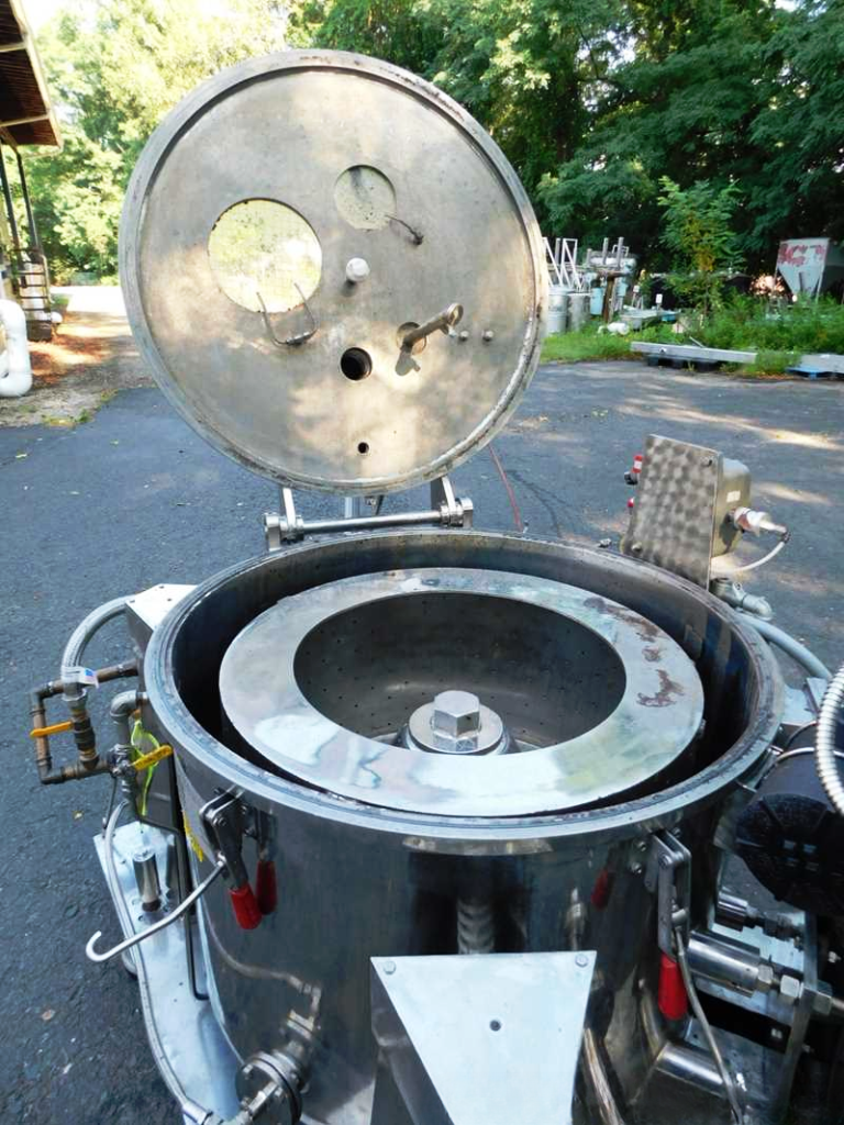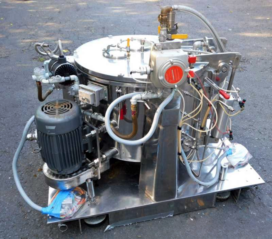 Max bowl speed 1450 RPM, 896 x G, 3.6 cuft capacity, 10.5 sqft filtration area, max load 342 lbs. Pharmaceutical grade, gastight design. 10 HP XP motor 230/460/3/60/1750 RPM, hinged top lid with toggle latches, 2 sight glasses, rotary spray ball, rapid gas purge system, liquid discharge pipe, mounted on SS base with casters and screw down floor pads, full documentation and original manual. Prior use: food processing. 2000 vintage. Very good condition.